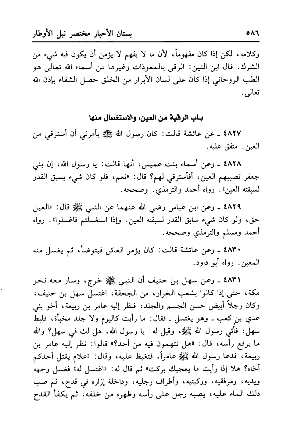 4827- عَنْ عَائِشَةَ قَالَتْ: كَانَ رَسُولُ اللهِ - صلى الله عليه وسلم - يَأْمُرنِي أَنْ أَسَتَرْقِي مِنْ الْعَيْنِ. مُتَّفَقٌ عَلَيْهِ.