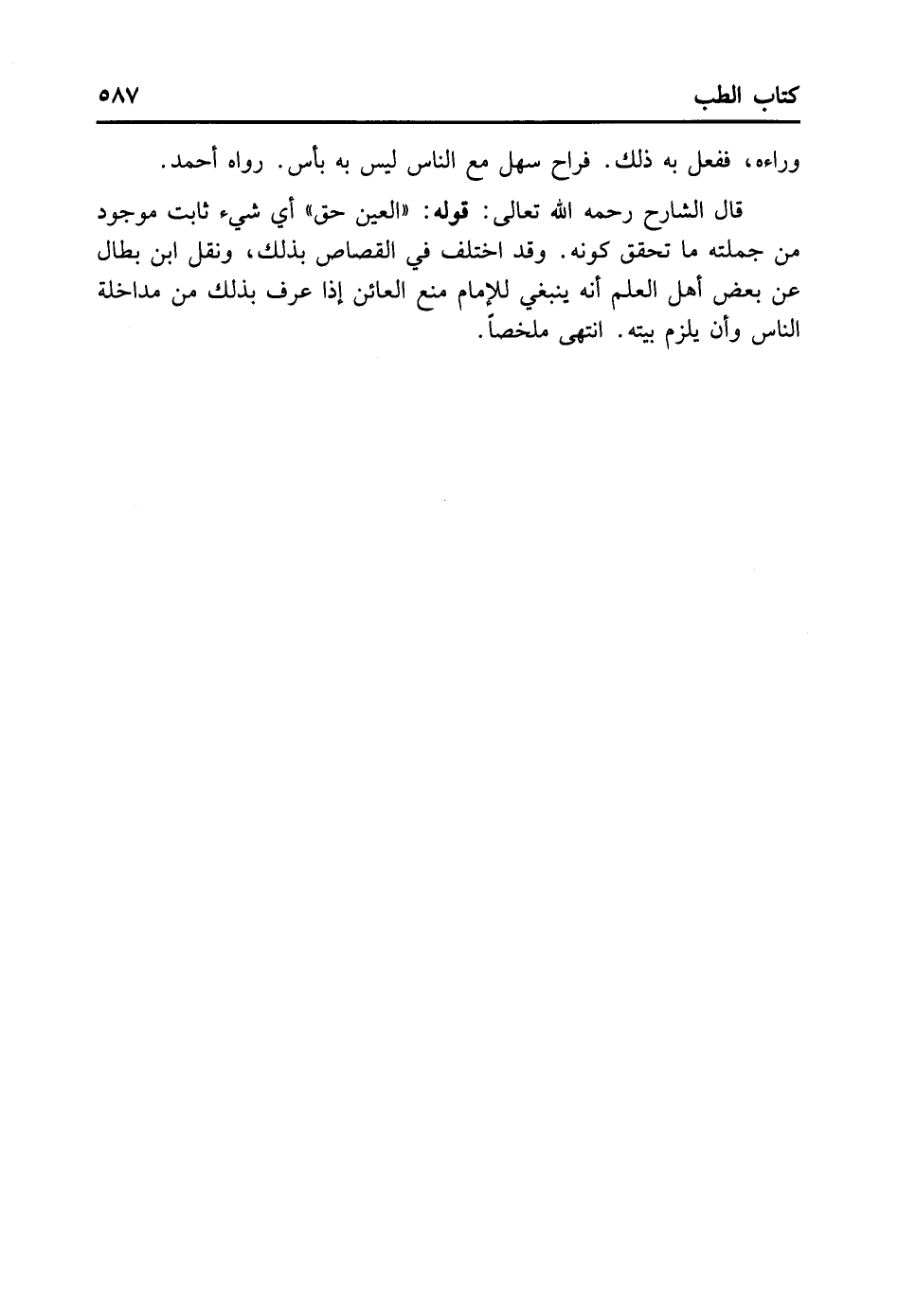 بَطَّالٍ عَنْ بَعْضِ أَهْلِ الْعِلْمِ أَنَّهُ يَنْبَغِي لِلإِمَامِ مَنْعُ الْعَائِنِ إذَا عُرِفَ بِذَلِكَ مِنْ مُدَاخَلَةِ النَّاسِ، وَأَنْ يَلْزَمَ بَيْتَهُ. انْتَهَى مُلَخَّصًا.