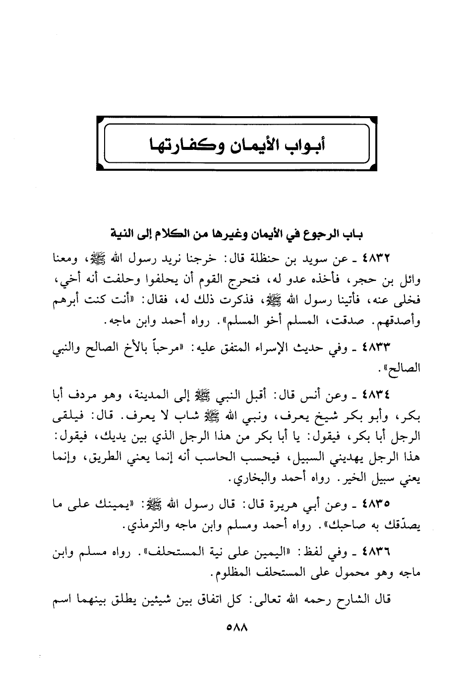 4832- عَنْ سُوَيْد بْنِ حَنْظَلَةَ قَالَ: خَرَجْنَا نُرِيدُ رَسُولَ اللهِ - صلى الله عليه وسلم - وَمَعَنَا وَائِلُ ابْنُ حُجْرٌ، فَأَخَذَهُ عَدُوٌّ لَهُ فَتَحَرَّجَ الْقَوْمُ أَنْ يَحْلِفُوا، وَحَلَفْتُ أَنَّهُ أَخِي فَخُلِّيَ عَنْهُ، فَأَتَيْنَا إلَى رَسُولِ اللهِ - صلى الله عليه وسلم - فَذَكَرْتُ ذَلِكَ لَهُ، فَقَالَ: «أَنْتَ كُنْتَ أَبَرَّهُمْ وَأَصْدَقَهُمْ صَدَقْتَ، الْمُسْلِمُ أَخُو الْمُسْلِمِ» . رَوَاهُ أَحْمَدُ وَابْنُ مَاجَةْ.