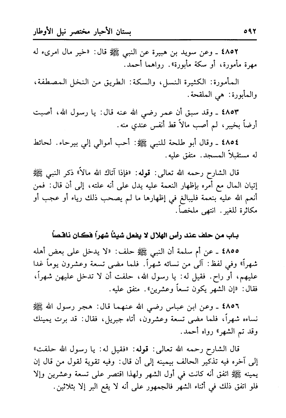 4856- وَعَنْ ابْنِ عَبَّاسٍ رَضِيَ اللهُ عَنْهُمَا قَالَ: هَجَرَ رَسُولُ اللهِ - صلى الله عليه وسلم - نِسَاءَهُ شَهْرًا، فَلَمَّا مَضَى تِسْعَةٌ وَعِشْرُونَ أَتَى جِبْرِيلُ فَقَالَ: قَدْ بَرَّتْ يَمِينُك وَقَدْ تَمَّ الشَّهْرُ. رَوَاهُ أَحْمَدُ.