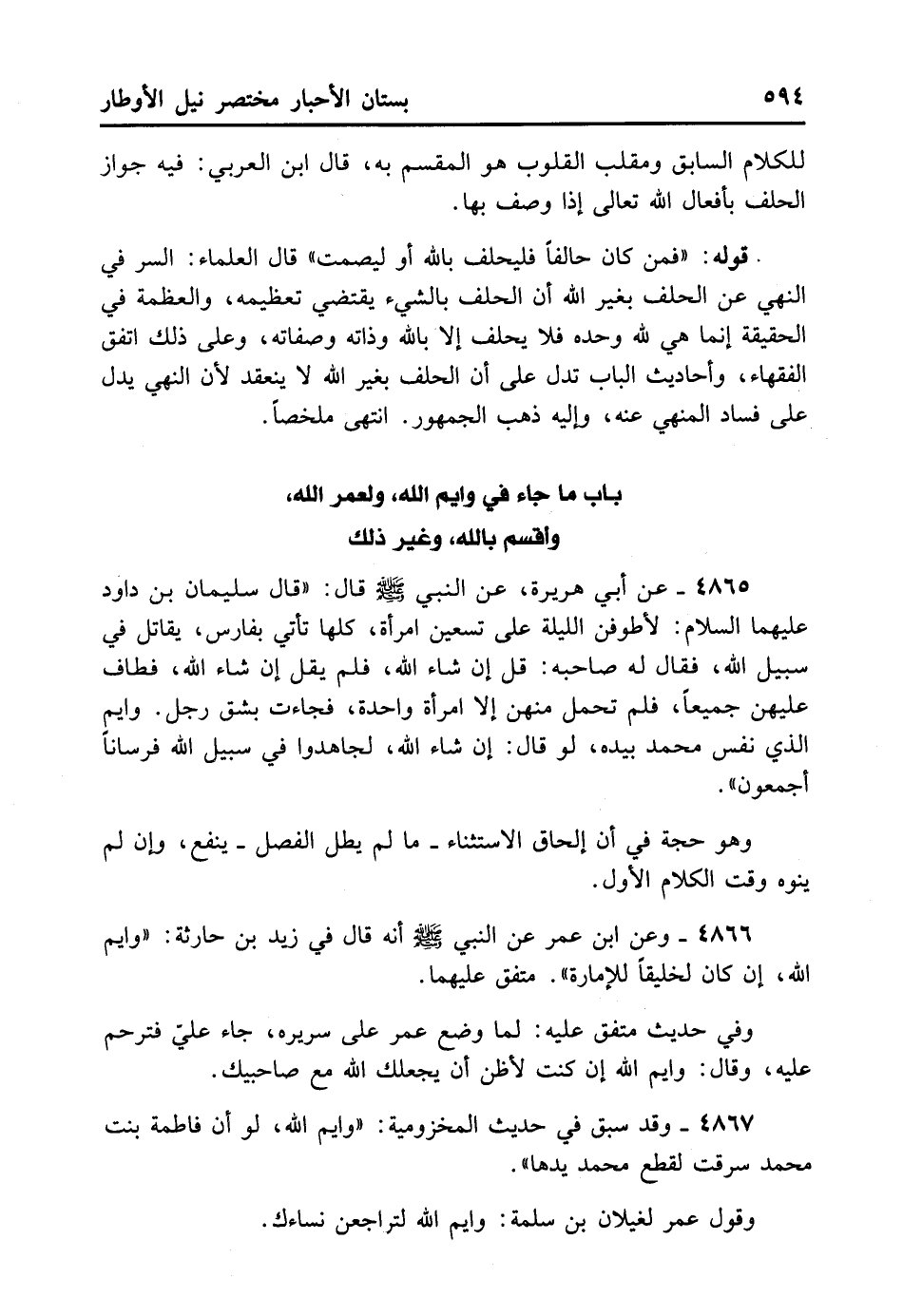 4865- عَنْ أَبِي هُرَيْرَةَ عَنْ النَّبِيِّ - صلى الله عليه وسلم - قَالَ: «قَالَ سُلَيْمَانُ بْنُ دَاوُد: لأطُوفَنَّ اللَّيْلَةَ عَلَى تِسْعِينَ امْرَأَةً كُلُّهَا تَأْتِي بِفَارِسٍ يُقَاتِلُ فِي سَبِيلِ اللهِ، فَقَالَ لَهُ صَاحِبُهُ: قُلْ إنْ شَاءَ اللهُ، فَلَمْ يَقُلْ إنْ شَاءَ اللهُ، فَطَافَ عَلَيْهِنَّ جَمِيعًا، فَلَمْ يَحْمِلْ مِنْهُنَّ إِلا امْرَأَةٌ وَاحِدَةٌ فَجَاءَتْ بِشِقِّ رَجُلٍ، وَأَيْمُ الَّذِي نَفْسُ مُحَمَّدٍ بِيَدِهِ لَوْ قَالَ إنْ شَاءَ اللهُ لَجَاهَدُوا فِي سَبِيلِ اللهِ فُرْسَانًا أَجْمَعُونَ» .