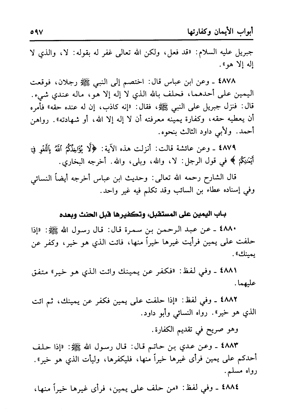 4880- عَنْ عَبْدِ الرَّحْمَنِ بْنِ سَمُرَةَ قَالَ: قَالَ رَسُولُ اللهِ - صلى الله عليه وسلم -: «إذَا حَلَفْتَ عَلَى يَمِينٍ فَرَأَيْتَ غَيْرَهَا خَيْرًا مِنْهَا. فَائْتِ الَّذِي هُوَ خَيْرٌ وَكَفِّرْ عَنْ يَمِينِكَ» .