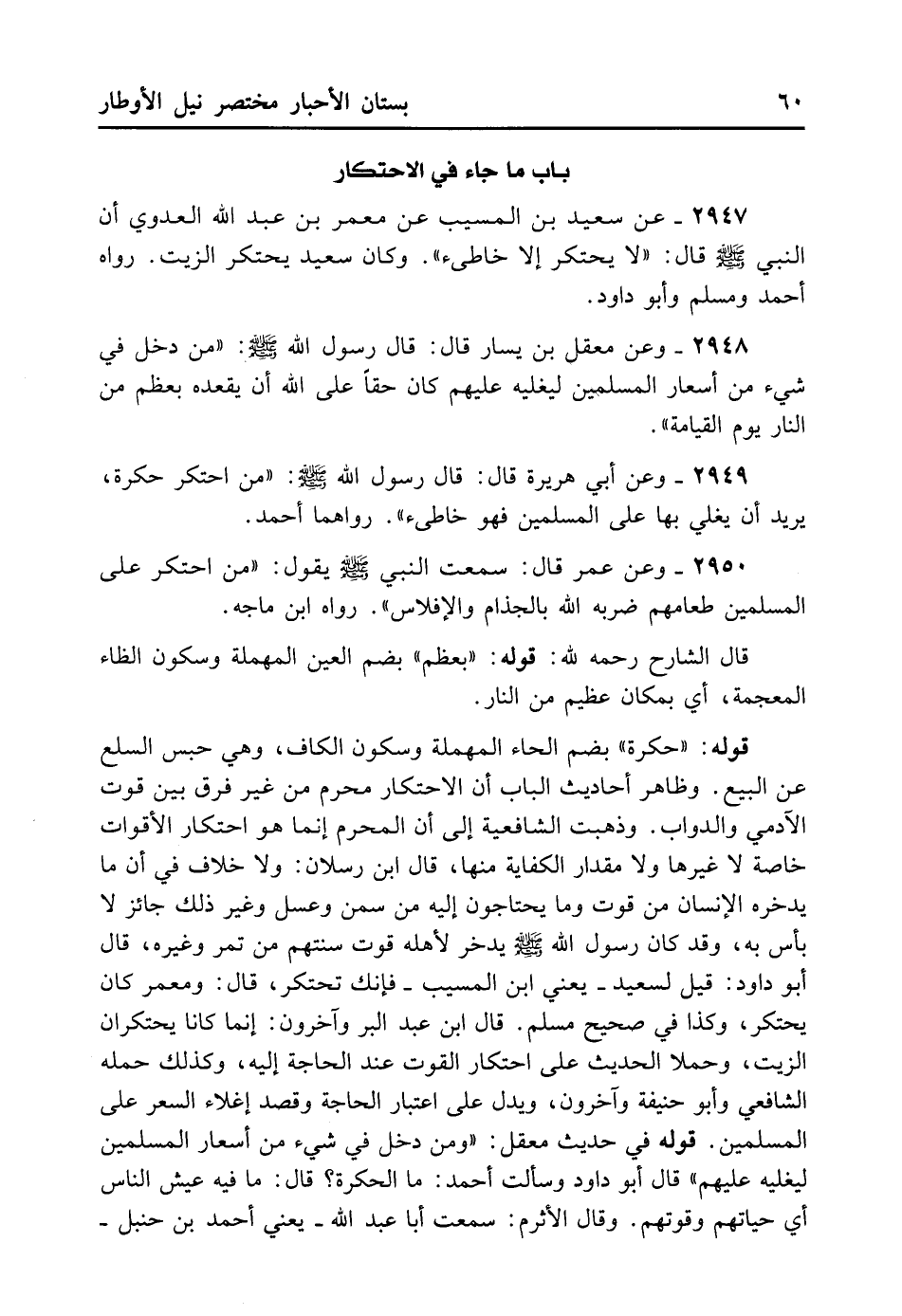 2947- عَنْ سَعِيدِ بْنِ الْمُسَيِّبِ عَنْ مَعْمَرِ بْنِ عَبْدِ اللَّهِ الْعَدَوِيِّ أَنَّ النَّبِيَّ - صلى الله عليه وسلم - قَالَ: «لا يَحْتَكِرُ إلا خَاطِئٌ» . وَكَانَ سَعِيدٌ يَحْتَكِرُ الزَّيْتَ رَوَاهُ أَحْمَدُ وَمُسْلِمٌ وَأَبُو دَاوُد.