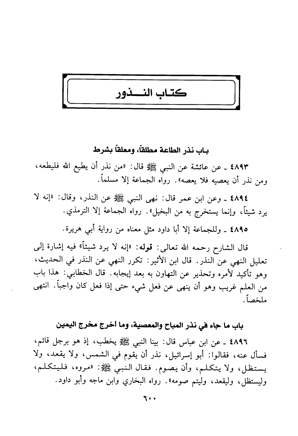 4893- عَنْ عَائِشَةَ عَنْ النَّبِيِّ - صلى الله عليه وسلم - قَالَ: «مَنْ نَذَرَ أَنْ يُطِيعَ اللهَ فَلْيُطِعْهُ، وَمَنْ نَذَرَ أَنْ يَعْصِيَهُ فَلا يَعْصِهِ» . رَوَاهُ الْجَمَاعَةُ إِلا مُسْلِمًا.