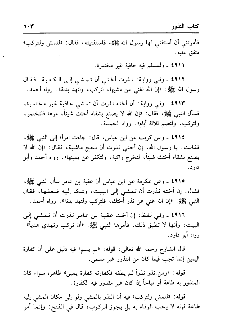 4916- وَفِي لَفْظٍ: إنَّ أُخْتَ عُقْبَةَ بْنِ عَامِرٍ نَذَرَتْ أَنْ تَمْشِيَ إلَى الْبَيْتِ وَإِنَّهَا لا تُطِيقُ ذَلِكَ، فَأَمَرَهَا النَّبِيُّ - صلى الله عليه وسلم - أَنْ تَرْكَبَ وَتُهْدِيَ هَدْيًا. رَوَاهُ أَبُو دَاوُد.