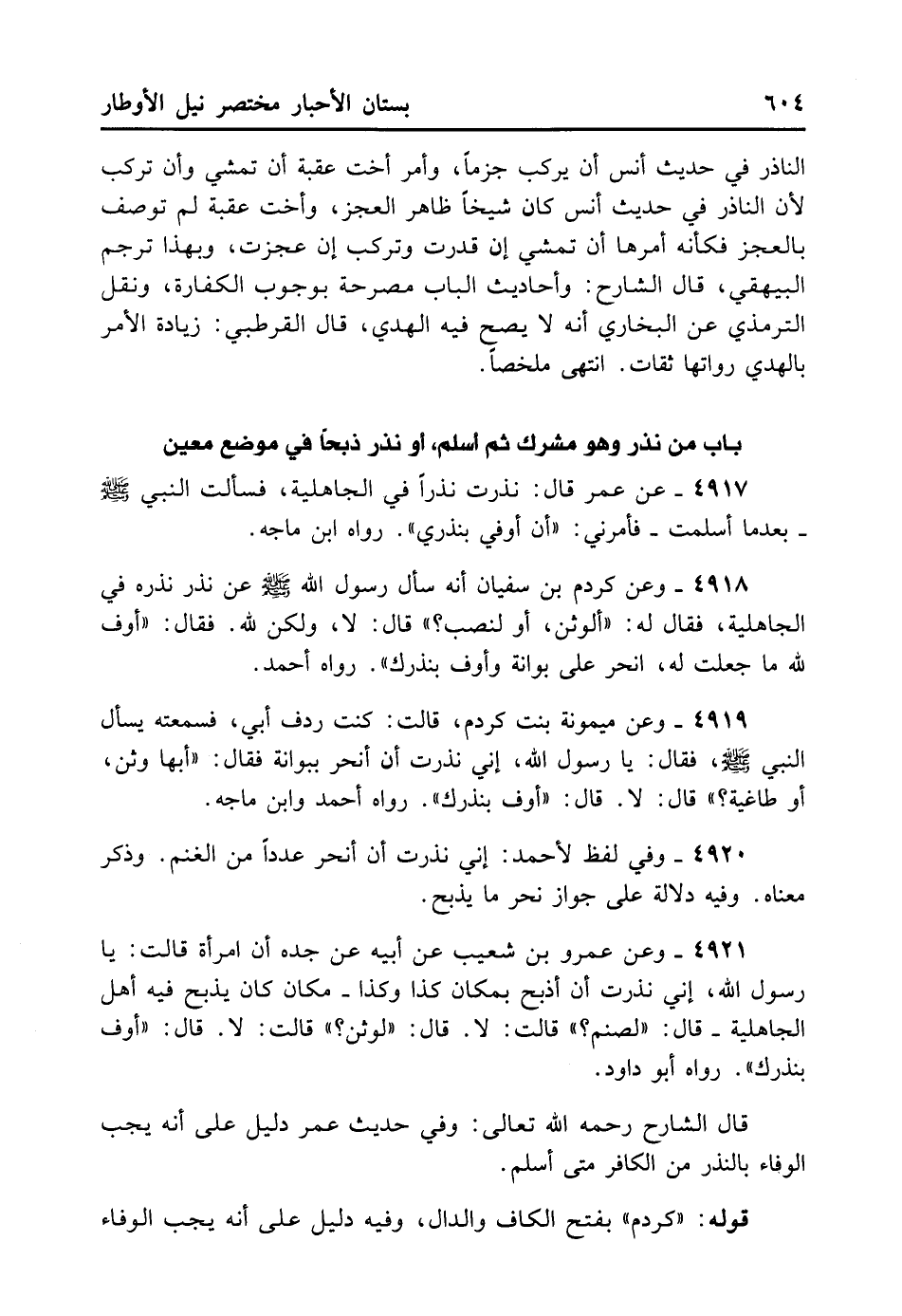 4918- وَعَنْ كَرْدَمِ بْنِ سُفْيَانَ: أَنَّهُ سَأَلَ رَسُولَ اللهِ - صلى الله عليه وسلم - عَنْ نَذْرٍ نَذَرَهُ فِي الْجَاهِلِيَّةِ، فَقَالَ لَهُ: «أَلِوَثَنٍ أَوْ لِنُصُبٍ» ؟ قَالَ: لا، وَلَكِنْ لِلَّهِ، فَقَالَ: ... «أَوْفِ لِلَّهِ مَا جَعَلْتَ لَهُ، انْحَرْ عَلَى بُوَانَةَ وَأَوْفِ بِنَذْرِكَ» . رَوَاهُ أَحْمَدُ.