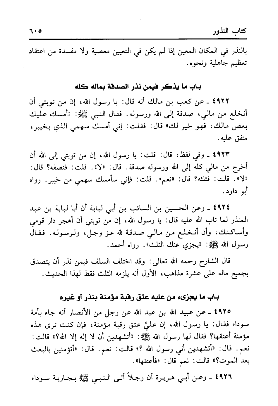 قَالَ الشَّارِحُ رَحِمَهُ اللهُ تَعَالَى: وَقَدْ اخْتَلَفَ السَّلَفُ فِيمَنْ نَذَرَ أَنْ يَتَصَدَّقَ بِجَمِيعِ مَالِهِ عَلَى عَشَرَةِ مَذَاهِبَ: الأوَّلُ: إنَّهُ يَلْزَمُهُ الثُّلُثُ فَقَطْ لِهَذَا الْحَدِيثِ.