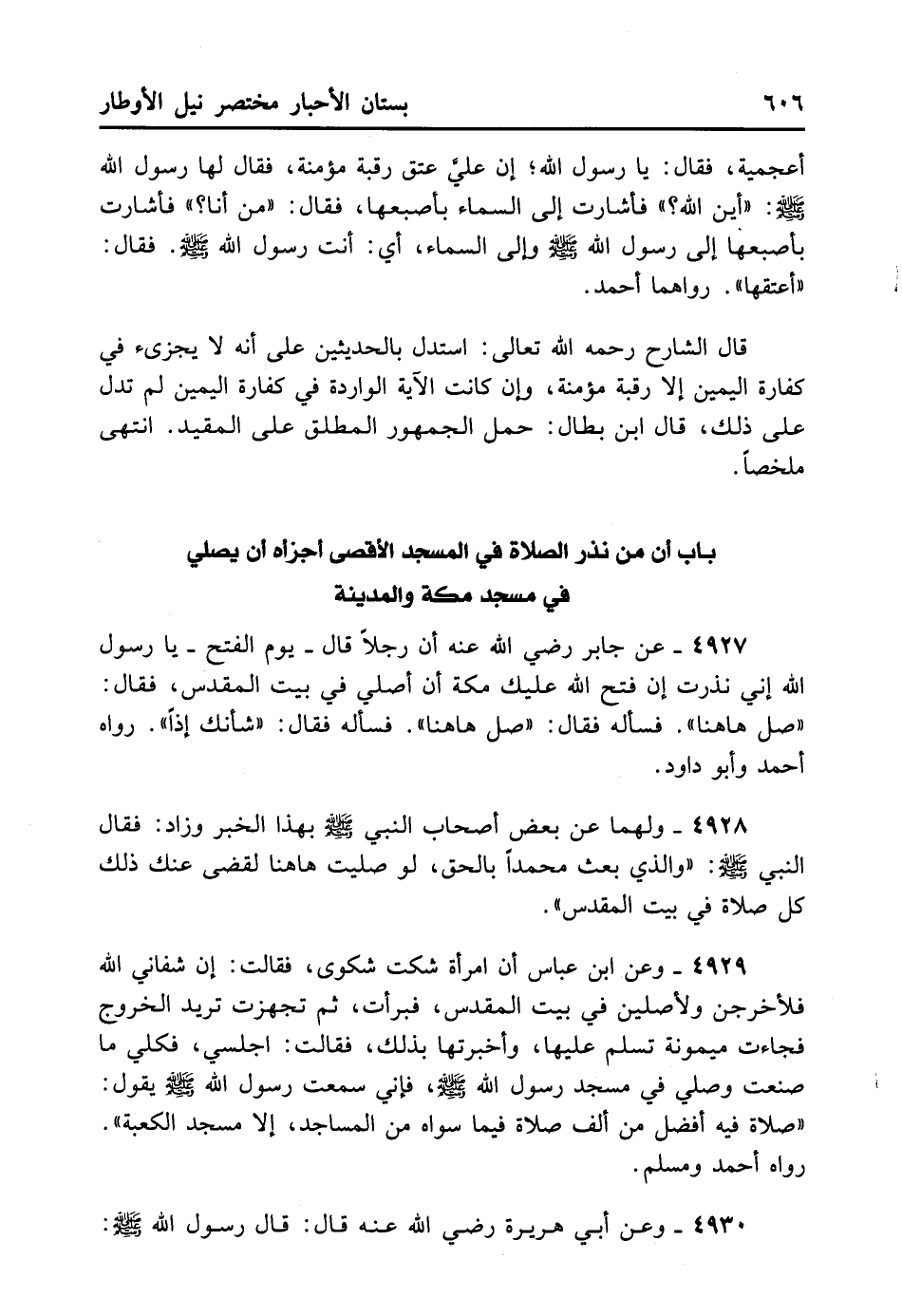 4929- وَعَنْ ابْنِ عَبَّاسٍ: أَنَّ امْرَأَةً شَكَتْ شَكْوَى فَقَالَتْ: إنْ شَفَانِي اللهُ فَلأخْرُجَنَّ فَلأُصَلِّيَنَّ فِي بَيْتِ الْمَقْدِسِ، فَبَرِأَتْ ثُمَّ تَجَهَّزَتْ تُرِيدُ الْخُرُوجَ. فَجَاءَتْ مَيْمُونَةُ تُسَلِّمُ عَلَيْهَا، فَأَخْبَرَتْهَا بِذَلِكَ، فَقَالَتْ: اجْلِسِي فَكُلِي مَا صَنَعْتِ وَصَلِّي فِي مَسْجِدِ الرَّسُولِ - صلى الله عليه وسلم - فَإِنِّي سَمِعْتُ رَسُولَ اللهِ - صلى الله عليه وسلم - يَقُولُ: ... «صَلاةٌ فِيهِ أَفْضَلُ مِنْ أَلْفِ صَلاةٍ فِيمَا سِوَاهُ مِنْ الْمَسَاجِدِ إِلا مَسْجِدَ الْكَعْبَةِ» . رَوَاهُ أَحْمَدُ وَمُسْلِمٌ.