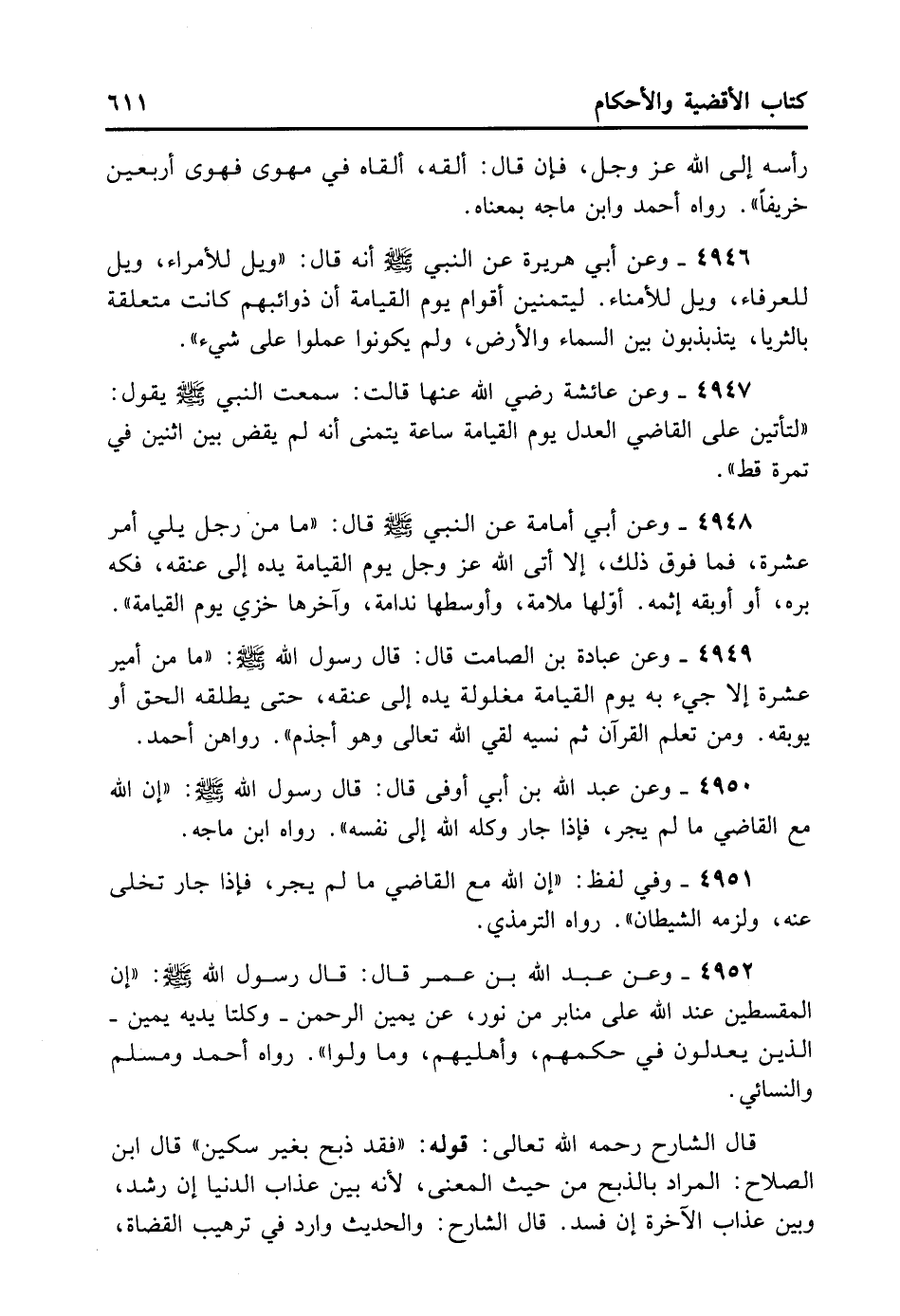 4949- وَعَنْ عُبَادَةَ بْنِ الصَّامِتِ قَالَ: قَالَ رَسُولُ اللهِ - صلى الله عليه وسلم -: «مَا مِنْ أَمِيرِ عَشَرَةٍ إِلا جِيءَ بِهِ يَوْمَ الْقِيَامَةِ مَغْلُولَةٌ يَدُهُ إلَى عُنُقِهِ، حَتَّى يُطْلِقَهُ الْحَقُّ أَوْ يُوبِقَهُ، وَمَنْ تَعَلَّمَ الْقُرْآنَ ثُمَّ نَسِيَهُ لَقِيَ اللهَ وَهُوَ أَجْذَمُ» . رَوَاهُنَّ أَحْمَدُ.