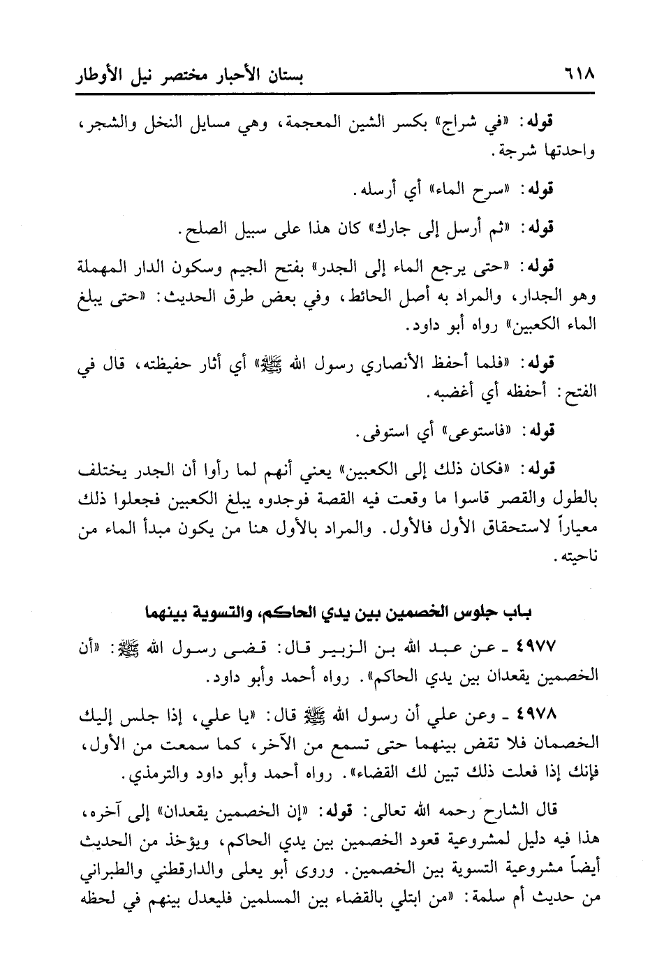4977- عَنْ عَبْدِ اللهِ بْنِ الزُّبَيْرِ قَالَ: قَضَى رَسُولُ اللهِ - صلى الله عليه وسلم - أَنَّ الْخَصْمَيْنِ يَقْعُدَانِ بَيْنَ يَدَيْ الْحَاكِمِ. رَوَاهُ أَحْمَدُ وَأَبُو دَاوُد.