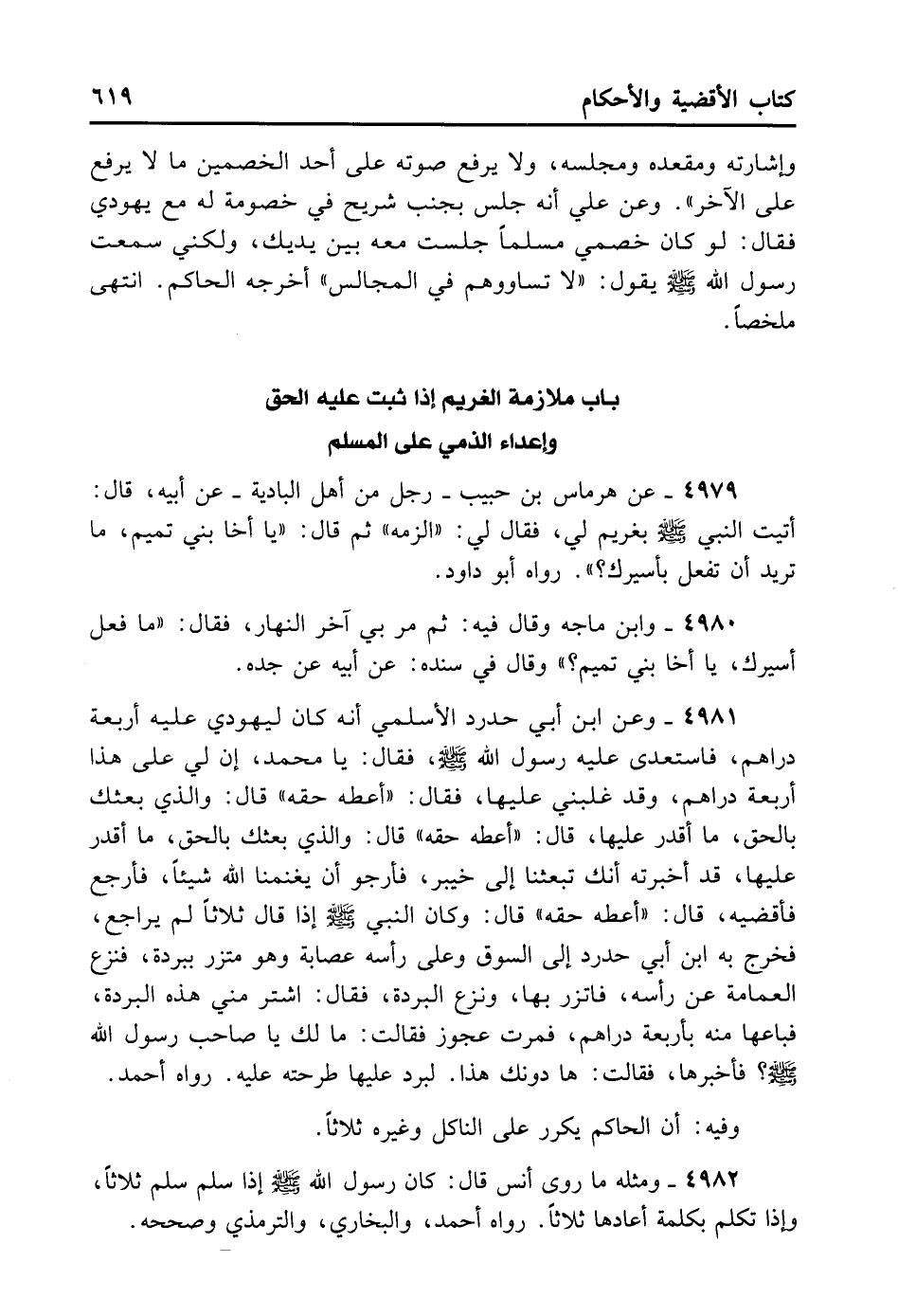 4981- وَعَنْ ابْنِ أَبِي حَدْرَدٍ الأسْلَمِيِّ أَنَّهُ كَانَ لِيَهُودِيٍّ عَلَيْهِ أَرْبَعَةُ دَرَاهِمَ فَاسْتَعْدَى عَلَيْهِ رَسُولَ اللهِ - صلى الله عليه وسلم - فَقَالَ: يَا مُحَمَّدُ إنَّ لِي عَلَى هَذَا أَرْبَعَةَ دَرَاهِمَ وَقَدْ غَلَبَنِي عَلَيْهَا، فَقَالَ: «أَعْطِهِ حَقَّهُ» . قَالَ: وَاَلَّذِي بَعَثَكَ بِالْحَقِّ مَا أَقْدِرُ عَلَيْهَا. قَالَ: «أَعْطِهِ حَقَّهُ» . قَالَ: وَاَلَّذِي بَعَثَكَ بِالْحَقِّ مَا أَقْدِرُ عَلَيْهَا، قَدْ أَخْبَرْتُهُ أَنَّكَ تَبْعَثُنَا إلَى خَيْبَرَ، فَأَرْجُو أَنْ يُغَنِّمنَا الله شَيْئًا فَأَرْجِعُ فَأَقْضِيَهُ، قَالَ: «أُعْطِهِ حَقَّهُ» . قَالَ: وَكَانَ النَّبِيُّ - صلى الله عليه وسلم - إذَا قَالَ ثَلاثًا لَمْ يُرَاجَعْ، فَخَرَجَ بِهِ ابْنُ أَبِي حَدْرَدٍ إلَى السُّوقِ وَعَلَى رَأْسِهِ عِصَابَةٌ وَهُوَ مُتَّزِرٌ بِبُرْدَةٍ، فَنَزَعَ الْعِمَامَةَ عَنْ رَأْسِهِ فَاتَّزَرَ بِهَا، وَنَزَعَ الْبُرْدَةَ ثُمَّ قَالَ: اشْتَرِ مِنِّي هَذِهِ الْبُرْدَةَ، فَبَاعَهَا مِنْهُ بِأَرْبَعَةِ دَرَاهِمَ، فَمَرَّتْ عَجُوزٌ فَقَالَتْ: مَا لَكَ يَا صَاحِبَ رَسُولِ اللهِ - صلى الله عليه وسلم - فَأَخْبَرَهَا، فَقَالَتْ: هَا دُونَكَ هَذَا الْبُرْدَ عَلَيْهَا طَرَحَتْهُ عَلَيْهِ. رَوَاهُ أَحْمَدُ.
