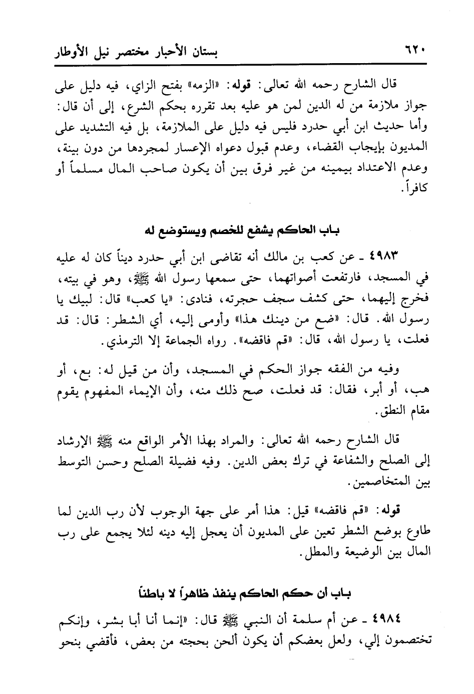 4983- عَنْ كَعْبِ بْنِ مَالِكٍ أَنَّهُ تَقَاضَى ابْنَ أَبِي حَدْرَدٍ دَيْنًا كَانَ لَهُ عَلَيْهِ فِي الْمَسْجِدِ، فَارْتَفَعَتْ أَصْوَاتُهُمَا حَتَّى سَمِعَهُمَا رَسُولُ اللهِ - صلى الله عليه وسلم - وَهُوَ فِي بَيْتِهِ، فَخَرَجَ إلَيْهِمَا حَتَّى كَشَفَ سِجْفَ حُجْرَتِهِ فَنَادَى: «يَا كَعْبُ» . قَالَ: لَبَّيْكَ يَا رَسُولَ اللهِ. قَالَ: «ضَعْ مِنْ دَيْنِكَ هَذَا» . وَأَوْمَأَ إلَيْهِ: أَيْ الشَّطْرَ، قَالَ: قَدْ فَعَلْتُ يَا رَسُولَ اللهِ، قَالَ: «قُمْ فَاقْضِهِ» . رَوَاهُ الْجَمَاعَةُ إِلا التِّرْمِذِيَّ.