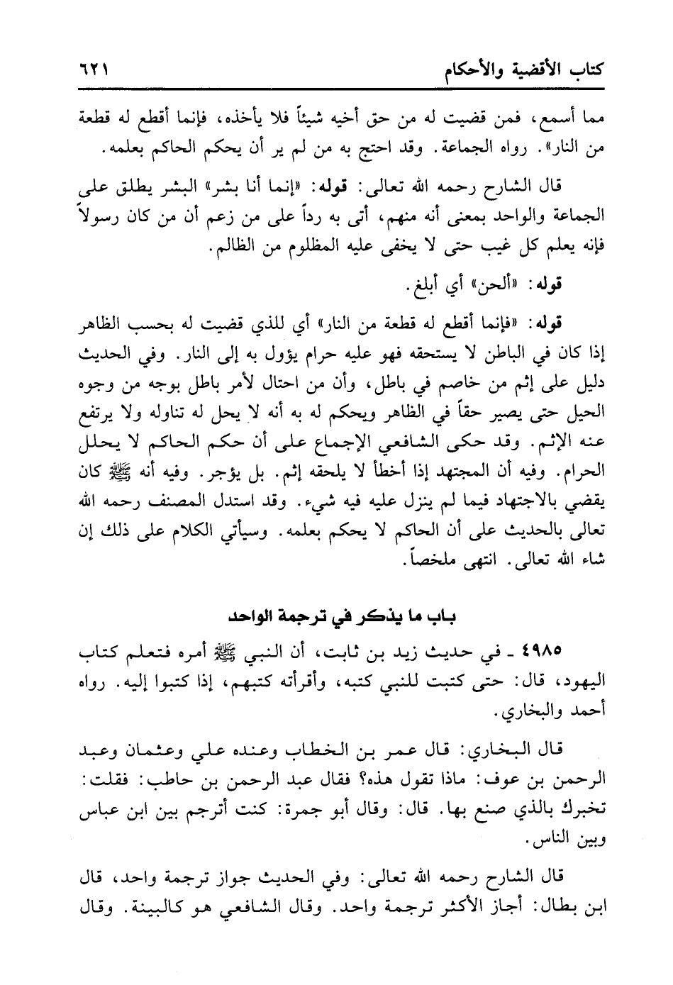مِمَّا أَسْمَعُ، فَمَنْ قَضَيْتُ لَهُ مِنْ حَقِّ أَخِيهِ شَيْئًا فَلا يَأْخُذْهُ فَإِنَّمَا أَقْطَعُ لَهُ قِطْعَةً مِنْ النَّارِ» . رَوَاهُ الْجَمَاعَةُ. وَقَدْ احْتَجَّ بِهِ مَنْ لَمْ يَرَ أَنْ يَحْكُمَ الْحَاكِمُ بِعِلْمِهِ.