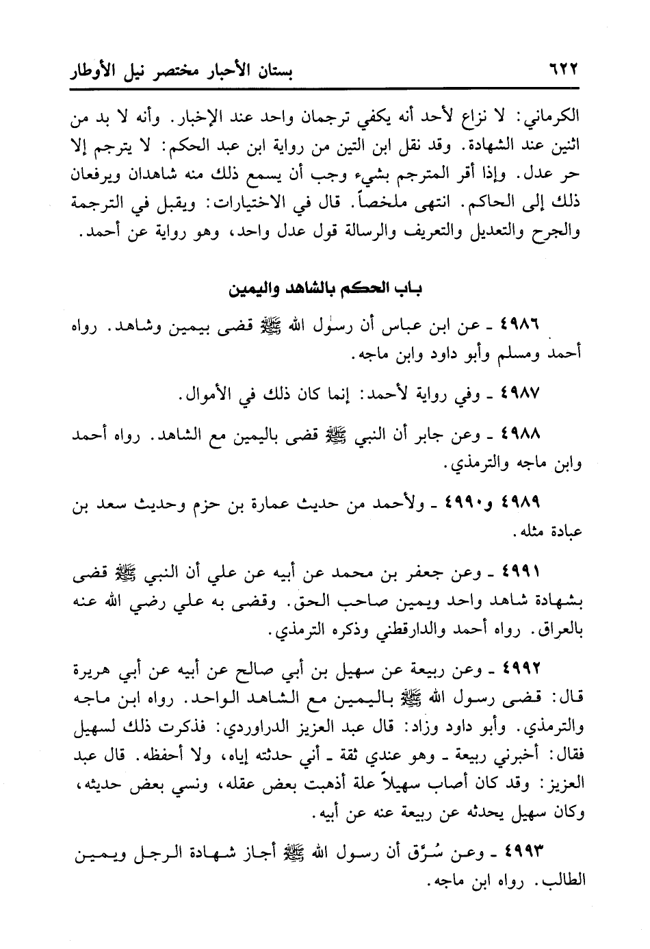 4988- وَعَنْ جَابِرٍ أَنَّ النَّبِيَّ - صلى الله عليه وسلم - قَضَى بِالْيَمِينِ مَعَ الشَّاهِدِ. رَوَاهُ أَحْمَدُ وَابْنُ مَاجَةْ وَالتِّرْمِذِيُّ.