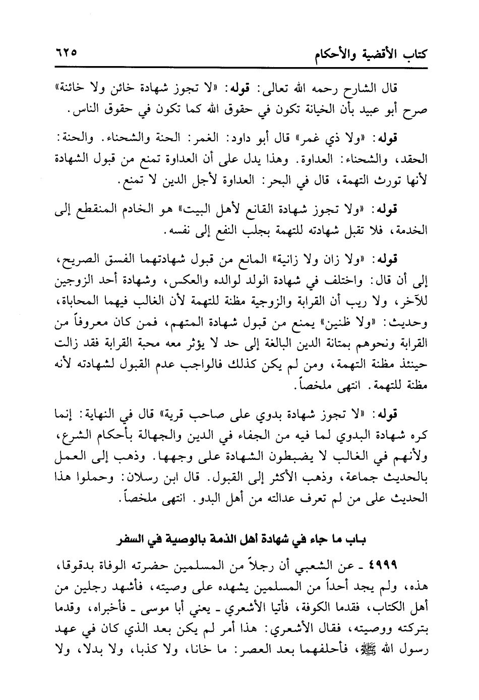 4999- عَنْ الشَّعْبِيِّ أَنَّ رَجُلاً مِنْ الْمُسْلِمِينَ حَضَرَتْهُ الْوَفَاةُ بِدَقُوقَا هَذِهِ وَلَمْ يَجِدْ أَحَدًا مِنْ الْمُسْلِمِينَ يُشْهِدُهُ عَلَى وَصِيَّتِهِ، فَأَشْهَدَ رَجُلَيْنِ مِنْ أَهْلِ الْكِتَابِ فَقَدِمَا الْكُوفَةَ فَأَتَيَا الأشْعَرِيَّ -يَعْنِي أَبَا مُوسَى- فَأَخْبَرَاهُ وَقَدِمَا بِتَرِكَتِهِ وَوَصِيَّتِهِ. فَقَالَ الأشْعَرِيُّ: هَذَا أَمْرٌ لَمْ يَكُنْ بَعْدَ الَّذِي كَانَ فِي عَهْدِ رَسُولِ اللهِ - صلى الله عليه وسلم - فَأَحْلِفْهُمَا بَعْدَ الْعَصْرِ مَا خَانَا وَلا كَذَبَا وَلا بَدَّلا وَلا