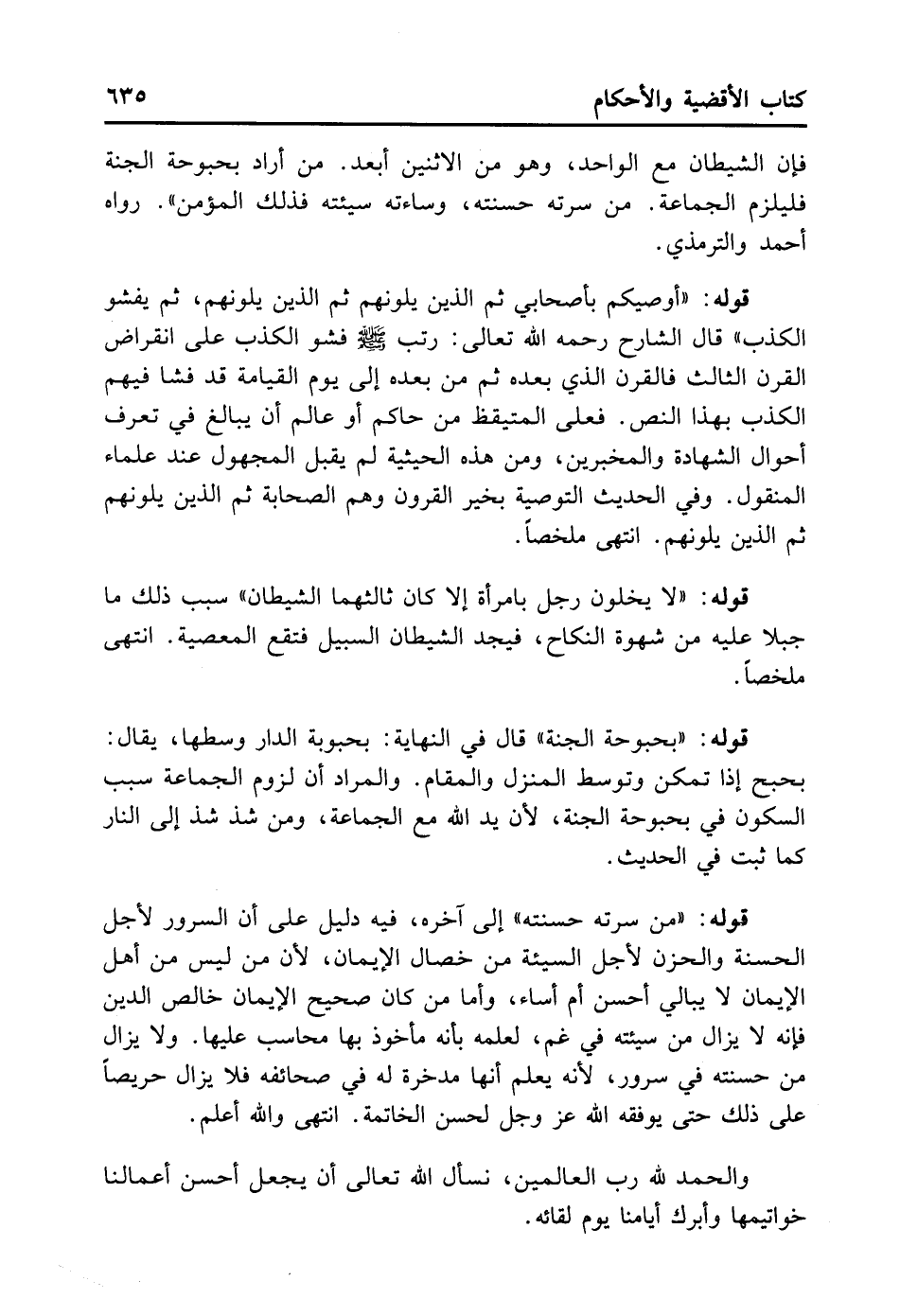 فَإِنَّ الشَّيْطَانَ مَعَ الْوَاحِدِ وَهُوَ مِنْ الِاثْنَيْنِ أَبْعَدُ، مَنْ أَرَادَ بُحْبُوحَةَ الْجَنَّةِ فَلْيَلْزَمْ الْجَمَاعَةَ، مَنْ سَرَّتْهُ حَسَنَتُهُ وَسَاءَتْهُ سَيِّئَتُهُ فَذَلِكَ الْمُؤْمِنُ» . رَوَاهُ أَحْمَدُ وَالتِّرْمِذِيُّ.