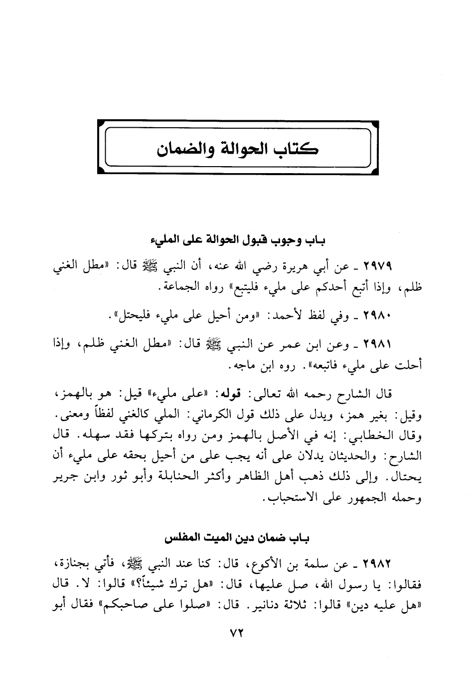 2979- عَنْ أَبِي هُرَيْرَةَ - رضي الله عنه - قَالَ أَنَّ النَّبِيَّ - صلى الله عليه وسلم -: «مَطْلُ الْغَنِيِّ ظُلْمٌ، وَإِذَا أُتْبِعَ أَحَدُهُمْ عَلَى مَلِيءٍ فَلْيَتْبَعْ» . رَوَاهُ الْجَمَاعَةُ.