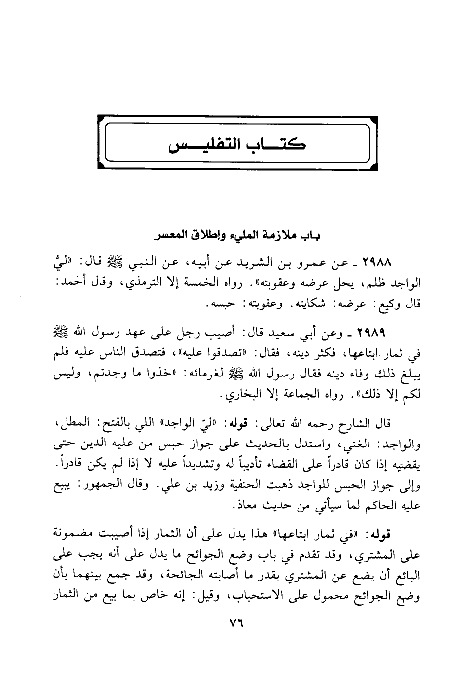2988- عَنْ عَمْرِو بْنِ الشَّرِيدِ عَنْ أَبِيهِ عَنْ النَّبِيِّ - صلى الله عليه وسلم - قَالَ: «لَيُّ الْوَاجِدِ ظُلْمٌ يُحِلُّ عِرْضَهُ وَعُقُوبَتَهُ» . رَوَاهُ الْخَمْسَةُ إلا التِّرْمِذِيَّ قَالَ أَحْمَدُ: قَالَ وَكِيعٌ: عِرْضَهُ: شِكَايَتُهُ وَعُقُوبَتَهُ: حَبْسُهُ.