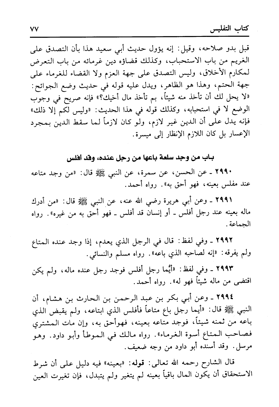 2993- وَفِي لَفْظٍ: «أَيُّمَا رَجُلٍ أَفْلَسَ فَوَجَدَ رَجُلٌ عِنْدَهُ مَالَهُ وَلَمْ يَكُنْ اقْتَضَى مِنْ مَالِهِ شَيْئًا فَهُوَ لَهُ» . رَوَاهُ أَحْمَدُ.