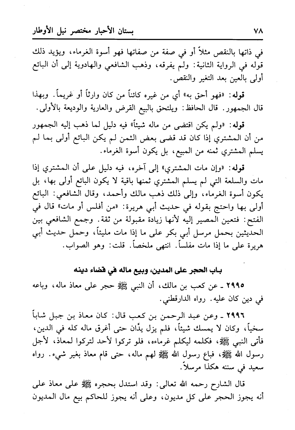 قَالَ الشَّارِحُ رَحِمَهُ اللهُ تَعَالَى: وَقَدْ تَقَدَّمَ وَقَدْ اُسْتُدِلَّ بِحَجْرِهِ - صلى الله عليه وسلم - عَلَى مُعَاذٍ أَنَّهُ يَجُوزُ الْحَجْرُ عَلَى كُلِّ مَدْيُونٍ، وَعَلَى أَنَّهُ يَجُوزُ لِلْحَاكِمِ بَيْعُ مَالِ الْمَدْيُونِ