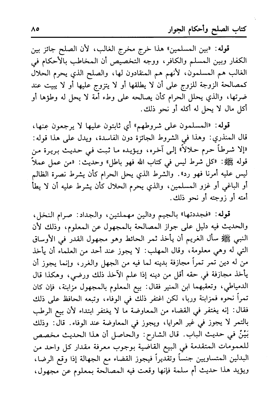 قَوْلُهُ: «بَيْنَ الْمُسْلِمِينَ» هَذَا خَرَجَ مَخْرَجَ الْغَالِبِ؛ لأَنَّ الصُّلْحَ جَائِزٌ بَيْنَ الْكُفَّارِ وَبَيْنَ الْمُسْلِمِ وَالْكَافِرِ وَوَجْهُ التَّخْصِيصِ أَنَّ الْمُخَاطَبَ بِالأَحْكَامِ فِي الْغَالِبِ هُمْ الْمُسْلِمُونَ؛ لأَنَّهُمْ هُمْ الْمُنْقَادُونَ لَهَا، وَالصُّلْحُ الَّذِي يُحَرِّمُ الْحَلالَ كَمُصَالَحَةِ الزَّوْجَةِ لِلزَّوْجِ عَلَى أَنْ لا يُطَلِّقَهَا أَوْ لا يَتَزَوَّجَ عَلَيْهَا أَوْ لا يَبِيتَ عِنْدَ ضَرَّتِهَا، وَاَلَّذِي يُحَلِّلُ الْحَرَامَ كَأَنْ يُصَالِحَهُ عَلَى وَطْءِ أَمَةٍ لا يَحِلُّ لَهُ وَطْؤُهَا، أَوْ أَكْلِ مَالٍ لا يَحِلُّ لَهُ أَكْلُهُ أَوْ نَحْوِ ذَلِكَ.