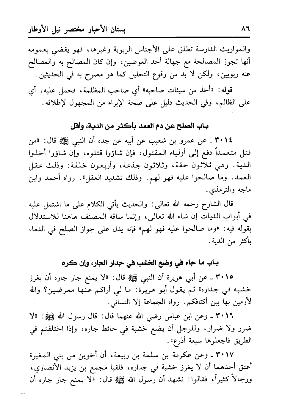 3016- وَعَنْ ابْنِ عَبَّاسٍ رَضِيَ اللَّهُ عَنْهُمَا قَالَ: قَالَ رَسُولُ اللَّهِ - صلى الله عليه وسلم -: «لا ضَرَرَ وَلا ضِرَارَ، وَلِلرَّجُلِ أَنْ يَضَعَ خَشَبَهُ فِي حَائِطِ جَارِهِ، وَإِذَا اخْتَلَفْتُمْ فِي الطَّرِيقِ فَاجْعَلُوهُ سَبْعَةَ أَذْرُعٍ» .