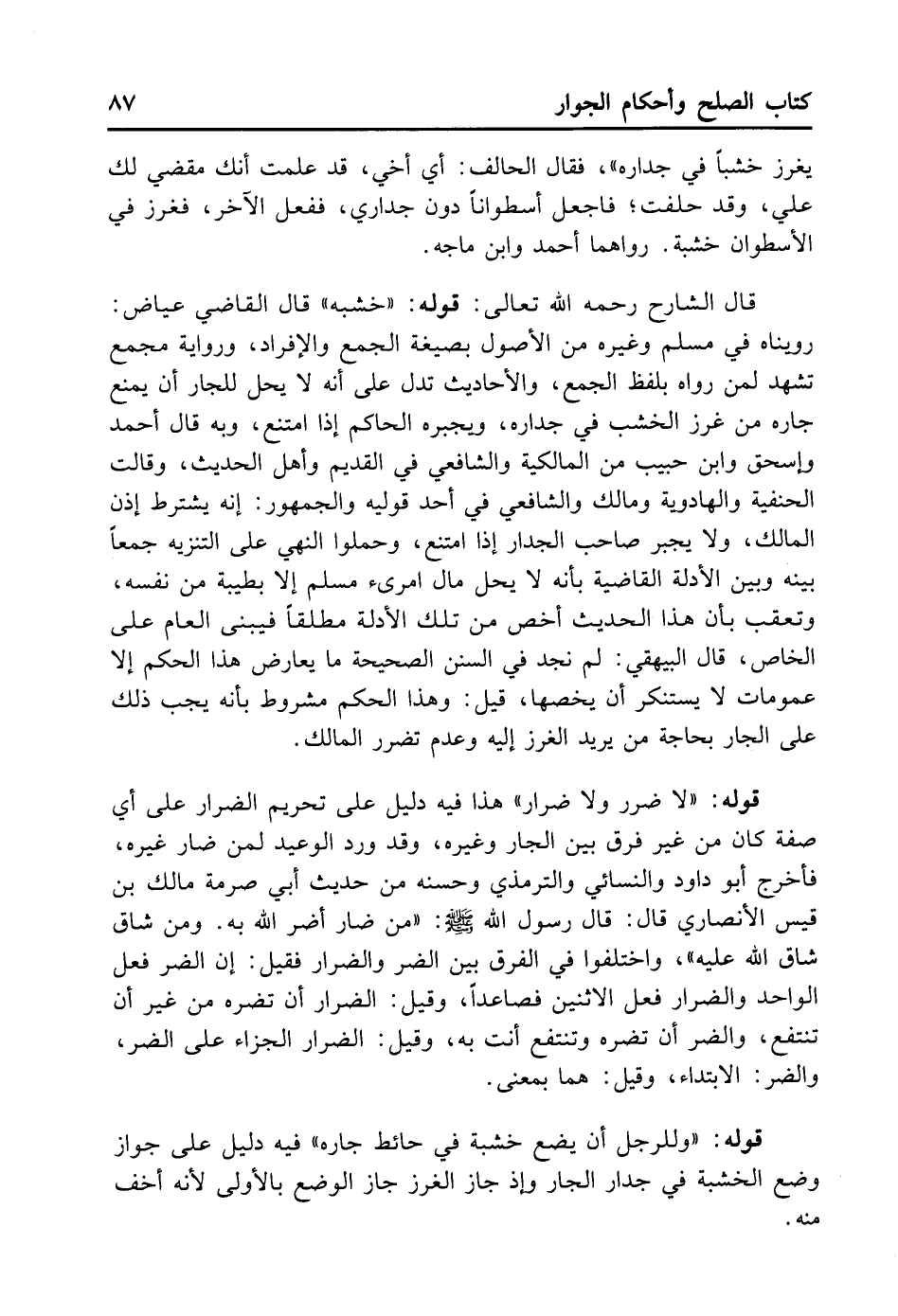 قَوْلُهُ: «لا ضَرَرَ وَلا ضِرَارَ» هَذَا فِيهِ دَلِيلٌ عَلَى تَحْرِيمِ الضِّرَارِ عَلَى أَيِّ صِفَةٍ كَانَ مِنْ غَيْرِ فَرْقٍ بَيْنَ الْجَارِ وَغَيْرِهِ، وَقَدْ وَرَدَ الْوَعِيدُ لِمَنْ ضَارَّ غَيْرَهُ، فَأَخْرَجَ أَبُو دَاوُد وَالنَّسَائِيُّ وَالتِّرْمِذِيُّ وَحَسَّنَهُ مِنْ حَدِيثِ أَبِي صِرْمَةَ مَالِكِ بْنِ قَيْسٍ الأَنْصَارِيِّ، قَالَ: قَالَ رَسُولُ اللَّهِ - صلى الله عليه وسلم -: «مَنْ ضَارَّ أَضَرَّ اللَّهُ بِهِ وَمَنْ شَاقَّ شاقَّ اللَّهُ عَلَيْهِ» وَاخْتَلَفُوا فِي الْفَرْقِ بَيْنَ الضُّرِّ وَالضِّرَارِ. فَقِيلَ: إنَّ الضُّرَّ: فِعْلُ الْوَاحِدِ، وَالضِّرَارَ: فِعْلُ الاثْنَيْنِ فَصَاعِدًا، وَقِيلَ: الضِّرَارُ: أَنْ تَضُرَّهُ بِغَيْرِ أَنْ تَنْتَفِعَ، وَالضُّرُّ: أَنْ تَضُرَّهُ وَتَنْتَفِعَ أَنْتَ بِهِ وَقِيلَ: الضِّرَارُ: الْجَزَاءُ عَلَى الضُّرِّ، وَالضُّرُّ: الابْتِدَاءُ وَقِيلَ: هُمَا بِمَعْنًى.