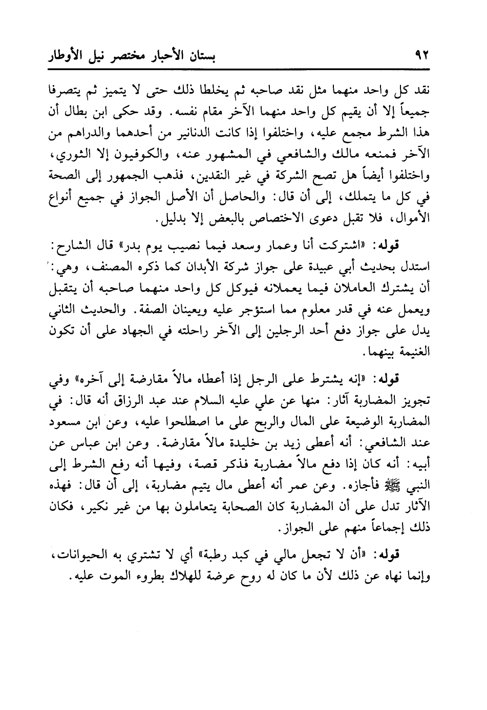 قَوْلُهُ: (اشْتَرَكْت أَنَا وَعَمَّارٌ وَسَعْدٌ فِيمَا نُصِيبُ يَوْمَ بَدْرٍ) قَالَ الشَّارِحُ: اُسْتُدِلَّ بِحَدِيثِ أَبِي عُبَيْدَةَ عَلَى جَوَازِ شَرِكَةِ الأَبْدَانِ كَمَا ذَكَرَهُ الْمُصَنِّفُ، وَهِيَ أَنْ يَشْتَرِكَ الْعَامِلانِ فِيمَا يَعْمَلانِهِ فَيُوَكِّلَ كُلُّ وَاحِدٍ مِنْهُمَا صَاحِبَهُ أَنْ يَتَقَبَّلَ وَيَعْمَلَ عَنْهُ فِي قَدْرٍ مَعْلُومٍ مِمَّا اُسْتُؤْجِرَ عَلَيْهِ وَيُعَيِّنَانِ الصَّفَةَ، وَالْحَدِيثُ الثَّانِي يَدُلُّ عَلَى جَوَازِ دَفْعِ أَحَدِ الرَّجُلَيْنِ إلَى الآخَرِ رَاحِلَتَهُ فِي الْجِهَادِ عَلَى أَنْ تَكُونَ الْغَنِيمَةُ بَيْنَهُمَا.