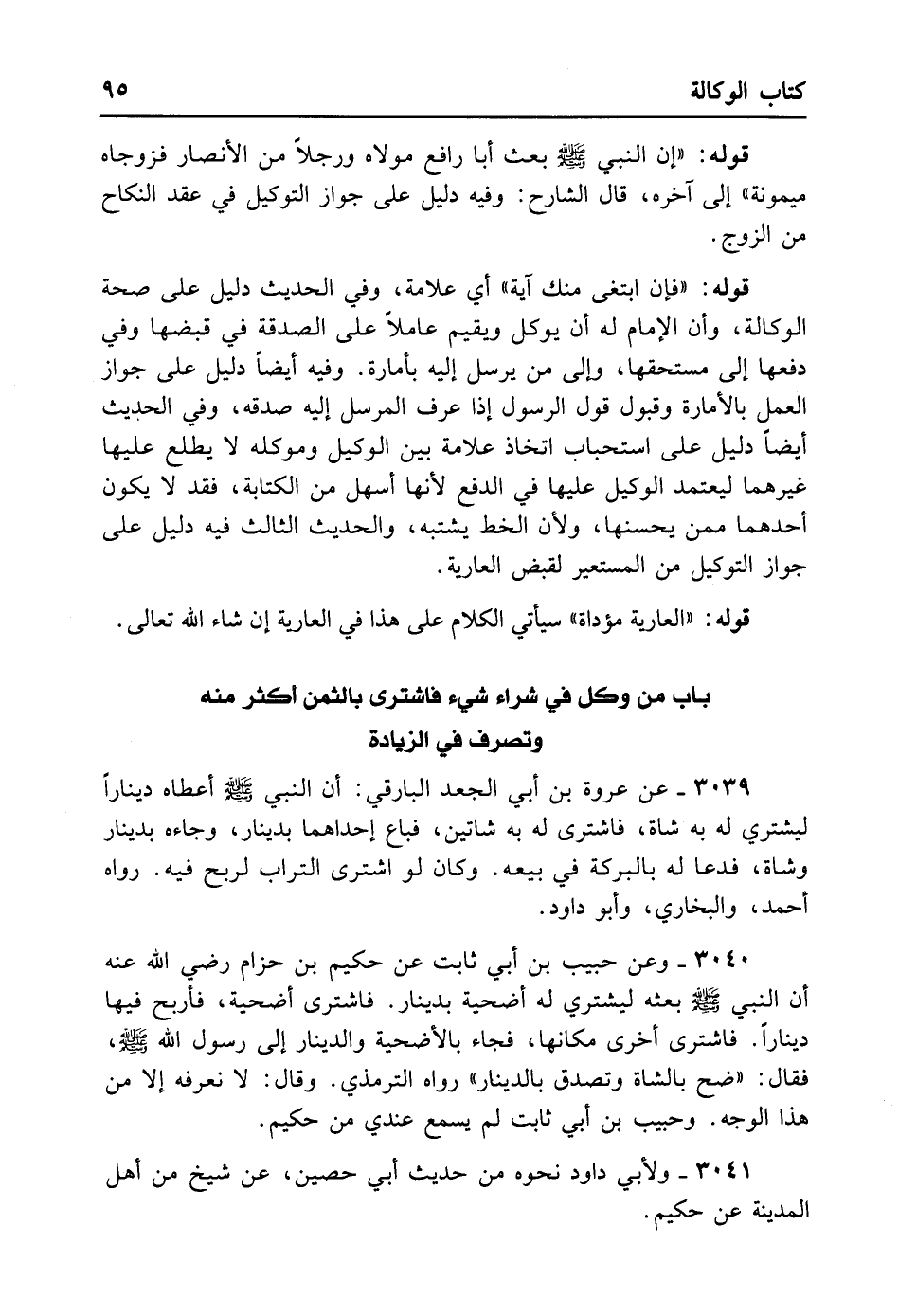 3039- عَنْ عُرْوَةَ بْنِ أَبِي الْجَعْدِ الْبَارِقِيِّ أَنَّ النَّبِيَّ - صلى الله عليه وسلم - أَعْطَاهُ دِينَارًا لِيَشْتَرِيَ بِهِ لَهُ شَاةً فَاشْتَرَى لَهُ بِهِ شَاتَيْنِ، فَبَاعَ إحْدَاهُمَا بِدِينَارٍ وَجَاءَهُ بِدِينَارٍ وَشَاةٍ،