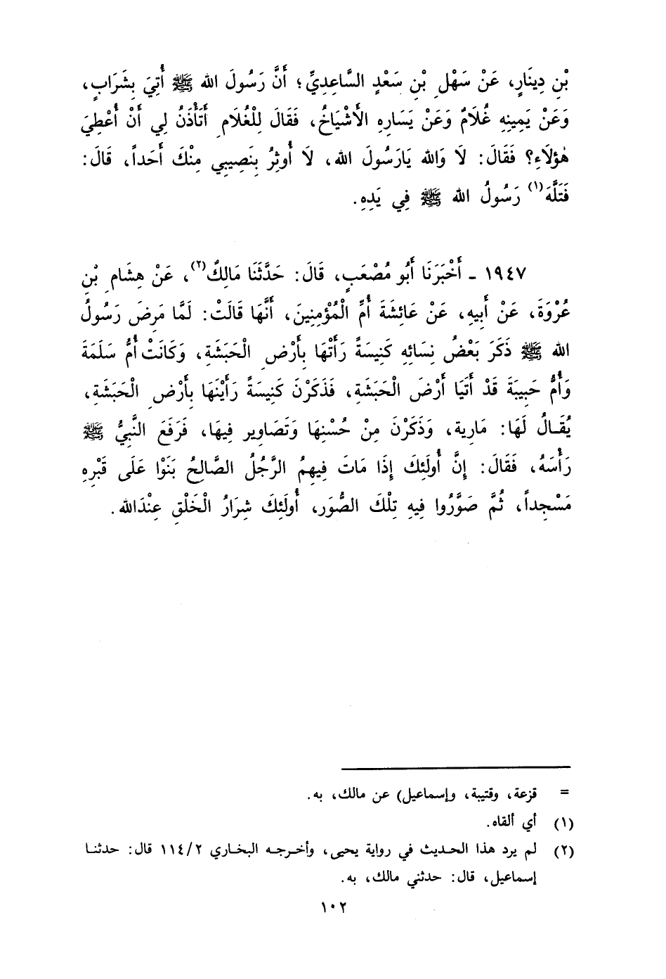 ١٩٤٧ - أَخْبَرَنَا أَبُو مُصْعَبٍ، قَالَ: حَدَّثَنَا مَالِكٌ، عَنْ هشام بْن عروة، عَنْ أَبِيهِ، عَنْ عائشة أم المؤمنين، أنها قالت: لما مرض رَسُول الله صَلى الله عَلَيه وَسَلم ذكر بعض نسائه كنيسةً رأتها بأرض الحبشة، وكانت أم سَلَمة وأم حبيبة قد أتيا أرض الحبشة، فذكرن كنيسة رأينها بأرض الحبشة، يقال لها: مارية، وذكرن من حسنها وتصاوير فيها، فرفع النَّبِيّ صَلى الله عَلَيه وَسَلم رأسه، فَقَالَ: إن أولئك إذَا مات فيهم الرجل الصالح بنوا عَلَى قبره مسجدًا، ثُمَّ صوروا فيه تِلْكَ الصور، أولئك شرار الخلق عند الله.