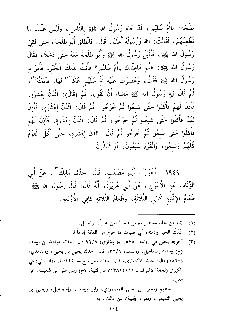 ١٩٤٩ - أَخْبَرَنَا أَبُو مُصْعَبٍ، قَالَ: حَدَّثَنَا مَالِكٌ، عَنْ أَبِي الزِّنَادِ، عَنْ الأَعْرَجِ، عَنْ أَبِي هُرَيْرَةَ، أنه قال: قال رَسُولَ اللَّهِ صَلى الله عَلَيه وَسَلم: طَعَامُ الاثْنَيْنِ كَافِي الثَّلَاثَةِ، وَطَعَامُ الثَّلَاثَةِ كَافِي الأَرْبَعَةِ.