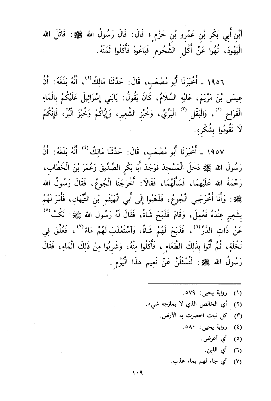 ١٩٥٧ - أَخْبَرَنَا أَبُو مُصْعَبٍ، قَالَ: حَدَّثَنَا مَالِكٌ؛ أَنَّهُ بَلَغَهُ، أَنَّ رَسُولَ اللهِ صَلَّى اللَّهُ عَلَيْهِ وَسَلَّمَ دَخَلَ الْمَسْجِدَ , فَوَجَدَ أَبَا بَكْرٍ الصِّدِّيقَ , وَعُمَرَ بْنَ الْخَطَّابِ , فَسَأَلَهُمَا، فَقَالَا: أَخْرَجَنَا الْجُوعُ، فَقَالَ رَسُولُ اللهِ صَلَّى اللَّهُ عَلَيْهِ وَسَلَّمَ: وَأَنَا أَخْرَجَنِي الْجُوعُ، فَذَهَبُوا إِلَى أَبِي الْهَيْثَمِ بْنِ التَّيِّهَانِ الأََنْصَارِيِّ، فَأَمَرَ لَهُمْ بِشَعِيرٍ عِنْدَهُ فيُعْمَلُ، وَقَامَ فذْبَحُ شَاةً، فَقَالَ له رَسُولُ اللهِ صَلَّى اللَّهُ عَلَيْهِ وَسَلَّمَ: نَكِّبْ عَنْ ذَاتِ الدَّرِّ، فَذَبَحَ لَهُمْ شَاةً، وَاسْتَعْذَبَ لَهُمْ مَاءً، فَعُلِّقَ فِي نَخْلَةٍ، ثُمَّ أُتُوا بِذَلِكَ الطَّعَامِ، فَأَكَلُوا مِنْهُ، وَشَرِبُوا مِنْ ذَلِكَ الْمَاءِ، فَقَالَ رَسُولُ اللهِ صَلَّى اللَّهُ عَلَيْهِ وَسَلَّمَ: لَتُسْأَلُنَّ عَنْ نَعِيمِ هَذَا الْيَوْمِ.