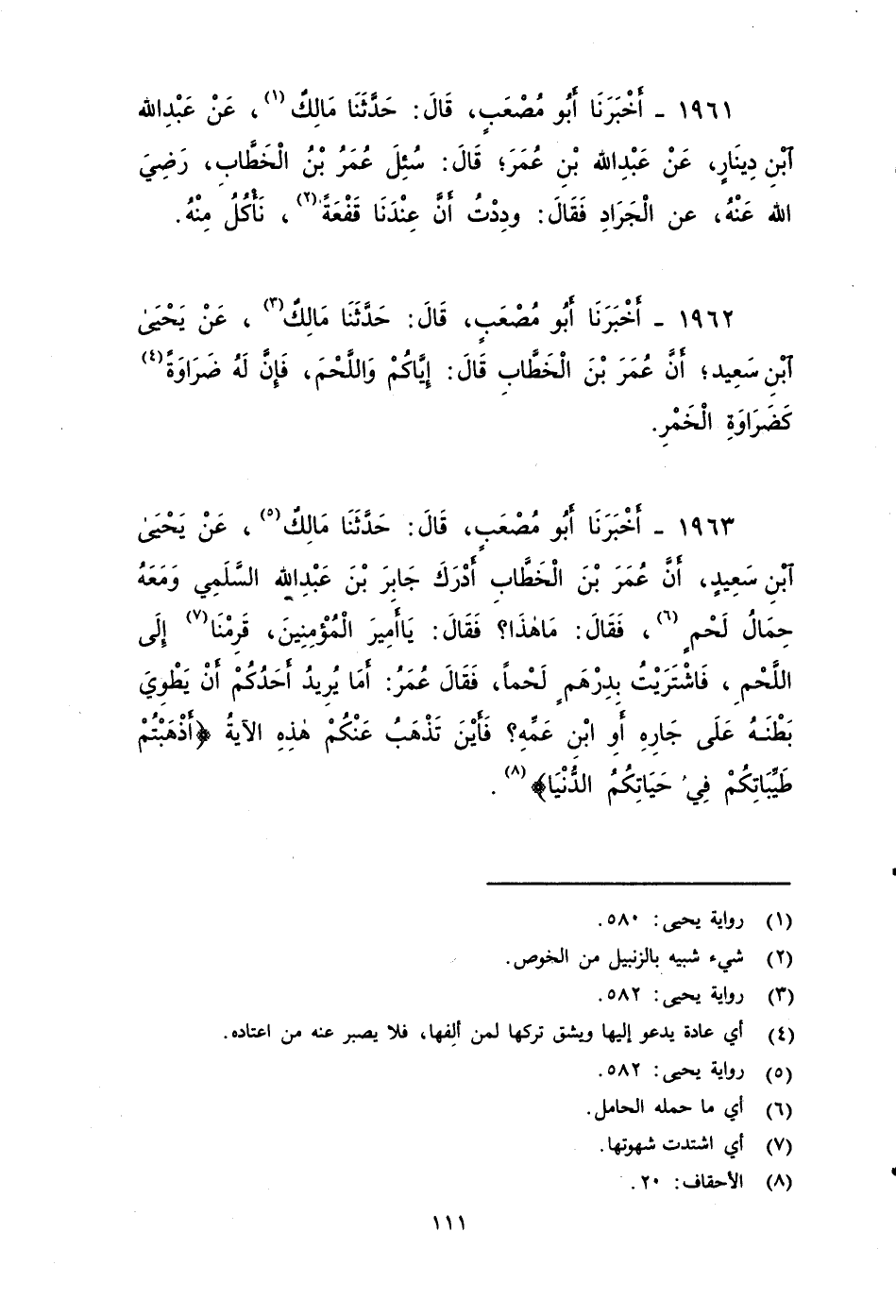 ١٩٦٣ - أَخْبَرَنَا أَبُو مُصْعَبٍ، قَالَ: حَدَّثَنَا مَالِكٌ، عَنْ يَحْيَى بْنِ سَعِيدٍ، أَنَّ عُمَرَ بْنَ الْخَطَّابِ أَدْرَكَ جَابِرَ بْنَ عَبْدِ اللهِ السلمي, وَمَعَهُ حِمَالُ لَحْمٍ، فَقَالَ: مَا هَذَا؟ فَقَالَ: يَا أَمِيرَ الْمُؤْمِنِينَ، قَرِمْنَا إِلَى اللَّحْمِ، فَاشْتَرَيْتُ بِدِرْهَمٍ لَحْمًا، فَقَالَ عُمَرُ: أَمَا يُرِيدُ أَحَدُكُمْ أَنْ يَطْوِيَ بَطْنَهُ عَلى جَارِهِ، أَوِ ابْنِ عَمِّهِ، فأَيْنَ تَذْهَبُ هَذِهِ الآيَةُ: {أَذْهَبْتُمْ طَيِّبَاتِكُمْ فِي حَيَاتِكُمُ الدُّنْيَا} ؟.