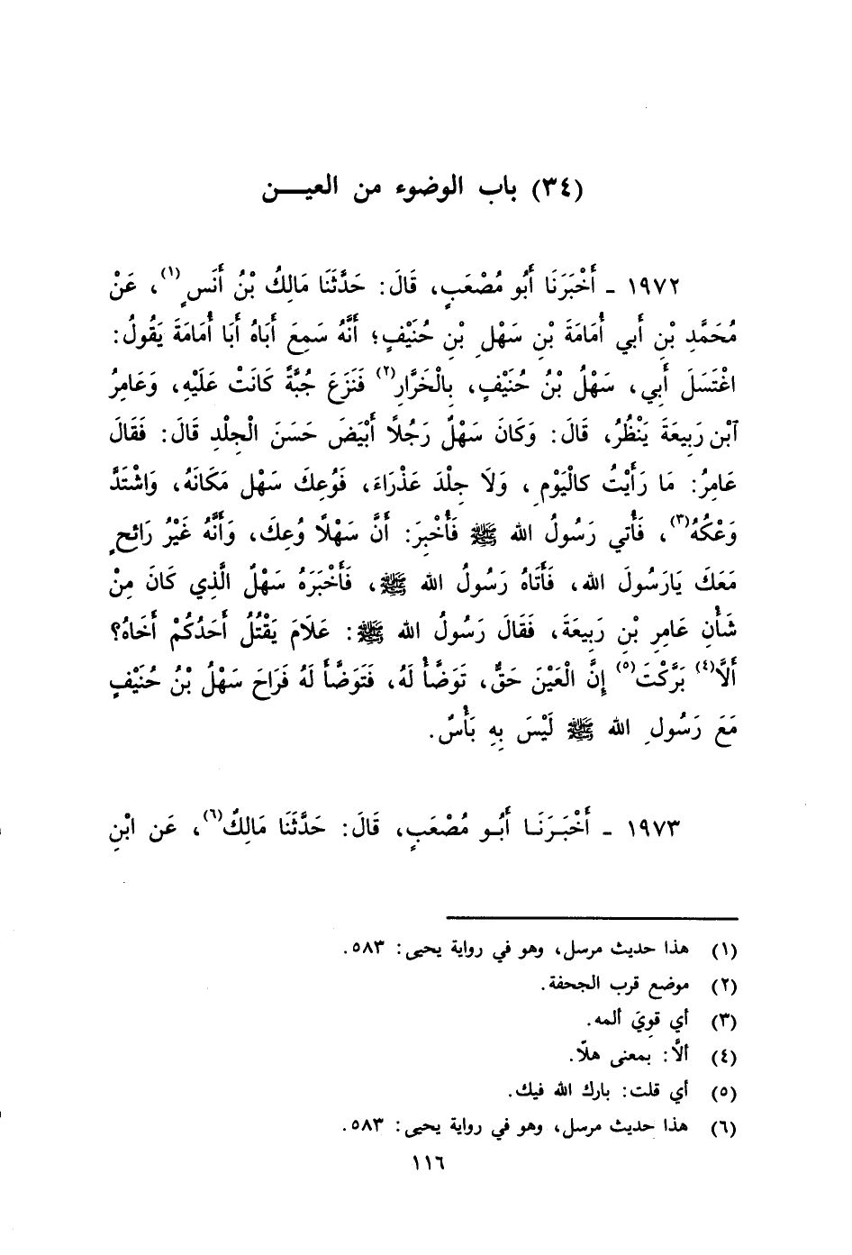 ١٩٧٢ - أَخْبَرَنَا أَبُو مُصْعَبٍ، قَالَ: حَدَّثَنَا مَالِكٌ بن أنس، عَنْ مُحَمَّدِ بْنِ أَبِي أُمَامَةَ بْنِ سَهْلِ بْنِ حُنَيْفٍ، أَنَّهُ سَمِعَ أَبَاهُ أبا أمامة، يَقُولُ: اغْتَسَلَ أَبِي، سَهْلُ بْنُ حُنَيْفٍ، بِالْخَرَّارِ فَنَزَعَ جُبَّةً كَانَتْ عَلَيْهِ، وَعَامِرُ بْنُ رَبِيعَةَ يَنْظُرُ، قَالَ: وَكَانَ سَهْلٌ رَجُلًا أَبْيَضَ حَسَنَ الْجِلْدِ، قَالَ: فَقَالَ عَامِرُ: مَا رَأَيْتُ كَالْيَوْمِ وَلَا جِلْدَ عَذْرَاءَ، فَوُعِكَ سَهْلٌ مَكَانَهُ، وَاشْتَدَّ وَعْكُهُ، فَأُتِيَ رَسُولُ اللَّهِ صَلى الله عَلَيه وَسَلم فَأُخْبِرَ أَنَّ سَهْلًا وُعِكَ، وَأَنَّهُ غَيْرُ رَائِحٍ مَعَكَ يَا رَسُولَ اللَّهِ، فَأَتَاهُ رَسُولُ اللَّهِ صَلى الله عَلَيه وَسَلم فَأَخْبَرَهُ سَهْلٌ بِالَّذِي كَانَ مِنْ شأن عَامِرٍ بن ربيعة، فَقَالَ رَسُولُ اللَّهِ صَلى الله عَلَيه وَسَلم: عَلَامَ يَقْتُلُ أَحَدُكُمْ أَخَاهُ؟ أَلَّا بَرَّكْتَ إِنَّ الْعَيْنَ حَقٌّ، تَوَضَّأْ لَهُ، فَتَوَضَّأَ لَهُ، فَرَاحَ سَهْلٌ بن حنيف مَعَ رَسُولِ اللَّهِ صَلى الله عَلَيه وَسَلم لَيْسَ بِهِ بَأْسٌ.