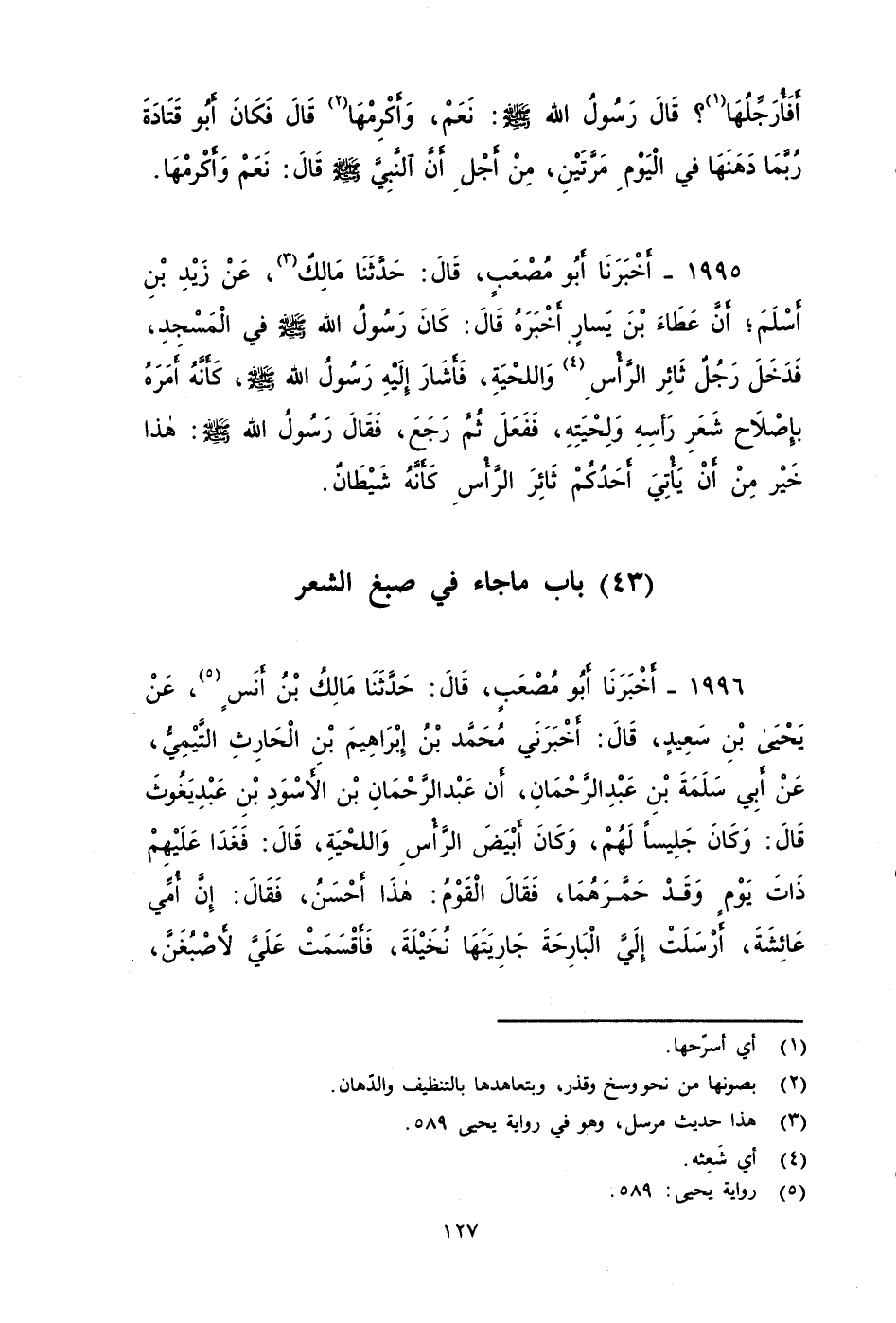١٩٩٥ - أَخْبَرَنَا أَبُو مُصْعَبٍ، قَالَ: حَدَّثَنَا مَالِكٌ، عَنْ زَيْدِ بْنِ أَسْلَمَ، أَنَّ عَطَاءَ بْنَ يَسَارٍ أَخْبَرَهُ، قَالَ: كَانَ رَسُولُ اللَّهِ صَلى الله عَلَيه وَسَلم فِي الْمَسْجِدِ فَدَخَلَ رَجُلٌ ثَائِرَ الرَّأْسِ وَاللِّحْيَةِ، فَأَشَارَ إِلَيْهِ رَسُولُ اللَّهِ صَلى الله عَلَيه وَسَلم، كَأَنَّهُ أمره إِصْلَاحَ شَعَرِ رَأْسِهِ وَلِحْيَتِهِ، فَفَعَلَ ثُمَّ رَجَعَ، فَقَالَ رَسُولُ اللَّهِ صَلى الله عَلَيه وَسَلم: هَذَا خَيْرًا مِنْ أَنْ يَأْتِيَ أَحَدُكُمْ ثَائِرَ الرَّأْسِ كَأَنَّهُ شَيْطَانٌ.