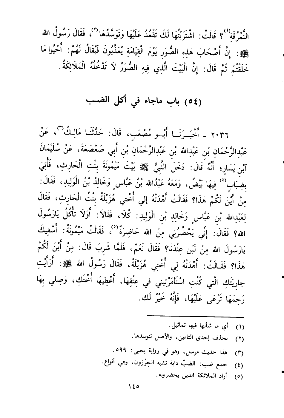 ٢٠٣٦ - أَخْبَرَنَا أَبُو مُصْعَبٍ، قَالَ: حَدَّثَنَا مَالِكٌ، عَنْ عَبْدِ الرَّحْمَنِ بْنِ عَبْدِ اللَّهِ بْنِ عَبْدِ الرَّحْمَنِ بْنِ أَبِي صَعْصَعَةَ، عَنْ سُلَيْمَانَ بْنِ يَسَارٍ، أَنَّهُ قَالَ: دَخَلَ النبي صَلى الله عَلَيه وَسَلم بَيْتَ مَيْمُونَةَ بِنْتِ الْحَارِثِ، فأتي بضِبَابٌ فِيهَا بَيْضٌ، وَمَعَهُ عَبْدُ اللَّهِ بْنُ عَبَّاسٍ، وَخَالِدُ بْنُ الْوَلِيدِ، فَقَالَ: مِنْ أَيْنَ لَكُمْ هَذَا؟ فَقَالَتْ: أَهْدَتْهُ لِي أُخْتِي هُزَيْلَةُ بِنْتُ الْحَارِثِ، فَقَالَ لِعَبْدِ اللَّهِ بْنِ عَبَّاسٍ، وَخَالِدِ بْنِ الْوَلِيدِ: كُلَا، فَقَالَا: أَوَلَا تَأْكُلُ يَا رَسُولَ اللَّهِ؟ فَقَالَ: إِنِّي يحْضُرُنِي مِنَ اللَّهِ حَاضِرَةٌ، فقَالَتْ مَيْمُونَةُ: أَسْقِيكَ يَا رَسُولَ اللَّهِ مِنْ لَبَنٍ عِنْدَنَا، فَقَالَ: نَعَمْ، فَلَمَّا شَرِبَ، قَالَ: مِنْ أَيْنَ لَكُمْ هَذَا؟ فَقَالَتْ: أَهْدَتْهُ لِي أُخْتِي هُزَيْلَةُ، فَقَالَ رَسُولُ اللَّهِ صَلى الله عَلَيه وَسَلم: أَرَأَيْتِ جَارِيَتَكِ الَّتِي كُنْتِ اسْتَأْمَرْتِينِي فِي عِتْقِهَا أَعْطِيهَا أُخْتَكِ وَصِلِي بِهَا رَحِمَها تَرْعَى عَلَيْهَا فَإِنَّهُ خَيْرٌ لَكِ.