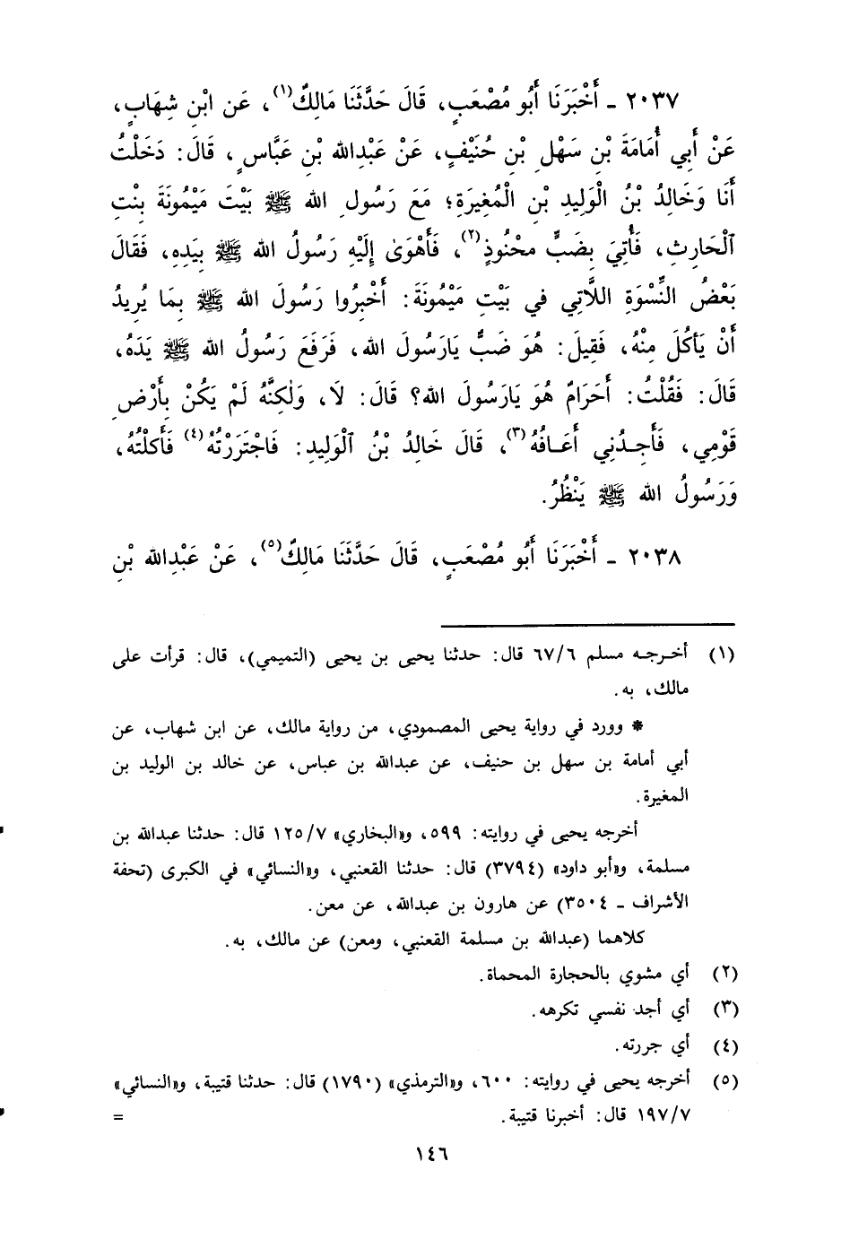 ٢٠٣٧ - أَخْبَرَنَا أَبُو مُصْعَبٍ، قَالَ: حَدَّثَنَا مَالِكٌ، عَنْ ابْنِ شِهَابٍ، عَنْ أَبِي أُمَامَةَ بْنِ سَهْلِ بْنِ حُنَيْفٍ، عَنْ عَبْدِ اللَّهِ بْنِ عَبَّاسٍ، قال: دخلت أنا وَخَالِدُ بْنُ الْوَلِيدِ بْنِ الْمُغِيرَةِ مَعَ رَسُولِ اللَّهِ صَلى الله عَلَيه وَسَلم بَيْتَ مَيْمُونَةَ بنت الحارث، فَأُتِيَ بِضَبٍّ مَحْنُوذٍ، فَأَهْوَى إِلَيْهِ رَسُولُ اللَّهِ صَلى الله عَلَيه وَسَلم بِيَدِهِ، فَقَالَ بَعْضُ النِّسْوَةِ اللَّاتِي فِي بَيْتِ مَيْمُونَةَ: أَخْبِرُوا رَسُولَ اللَّهِ صَلى الله عَلَيه وَسَلم بِمَا يُرِيدُ أَنْ يَأْكُلَ مِنْهُ، فَقِيلَ: هُوَ ضَبٌّ يَا رَسُولَ اللَّهِ، فَرَفَعَ رسول الله صَلى الله عَلَيه وَسَلم يَدَهُ، قال: فَقُلْتُ: أَحَرَامٌ هُوَ يَا رَسُولَ اللَّهِ؟ قَالَ: لا وَلَكِنَّهُ لَمْ يَكُنْ بِأَرْضِ قَوْمِي فَأَجِدُنِي أَعَافُهُ، قَالَ خَالِدُ بن الوليد: فَاجْتَرَرْتُهُ فَأَكَلْتُهُ، وَرَسُولُ اللَّهِ صَلى الله عَلَيه وَسَلم يَنْظُرُ.