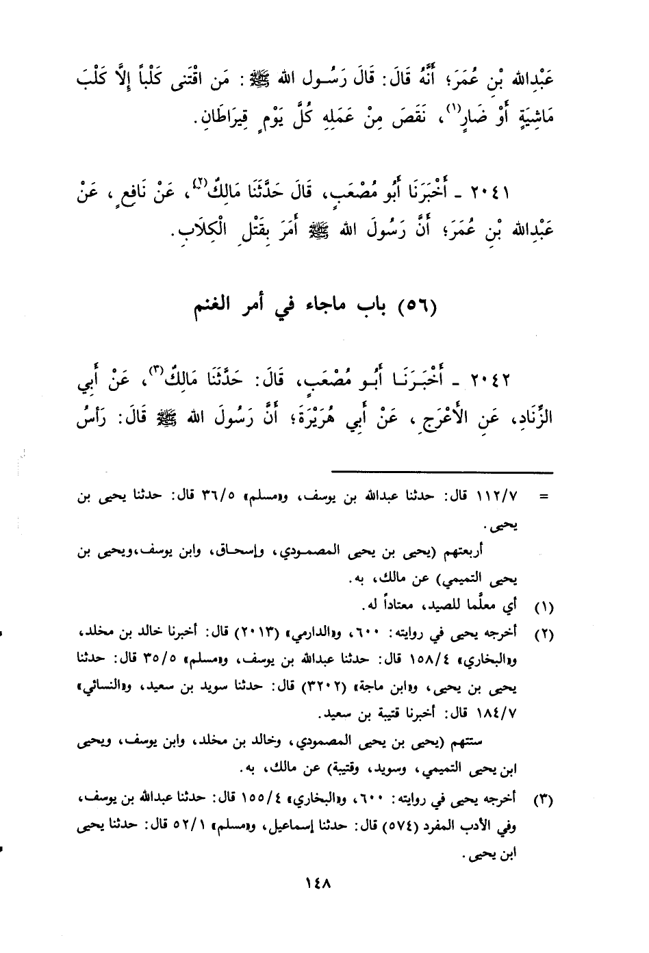 ٢٠٤٠ - أَخْبَرَنَا أَبُو مُصْعَبٍ، قَالَ: حَدَّثَنَا مَالِكٌ، عَنْ نَافِعٍ، عَنِ عبد الله بْنِ عُمَرَ، أنه قال: قال: أَنَّ رَسُولَ اللَّهِ صَلى الله عَلَيه وَسَلم: مَنِ اقْتَنَى كَلْبًا إِلَّا كَلْبًا مَاشِيَةٍ أو ضار، نَقَصَ مِنْ عَمَلِهِ كُلَّ يَوْمٍ قِيرَاطَانِ.