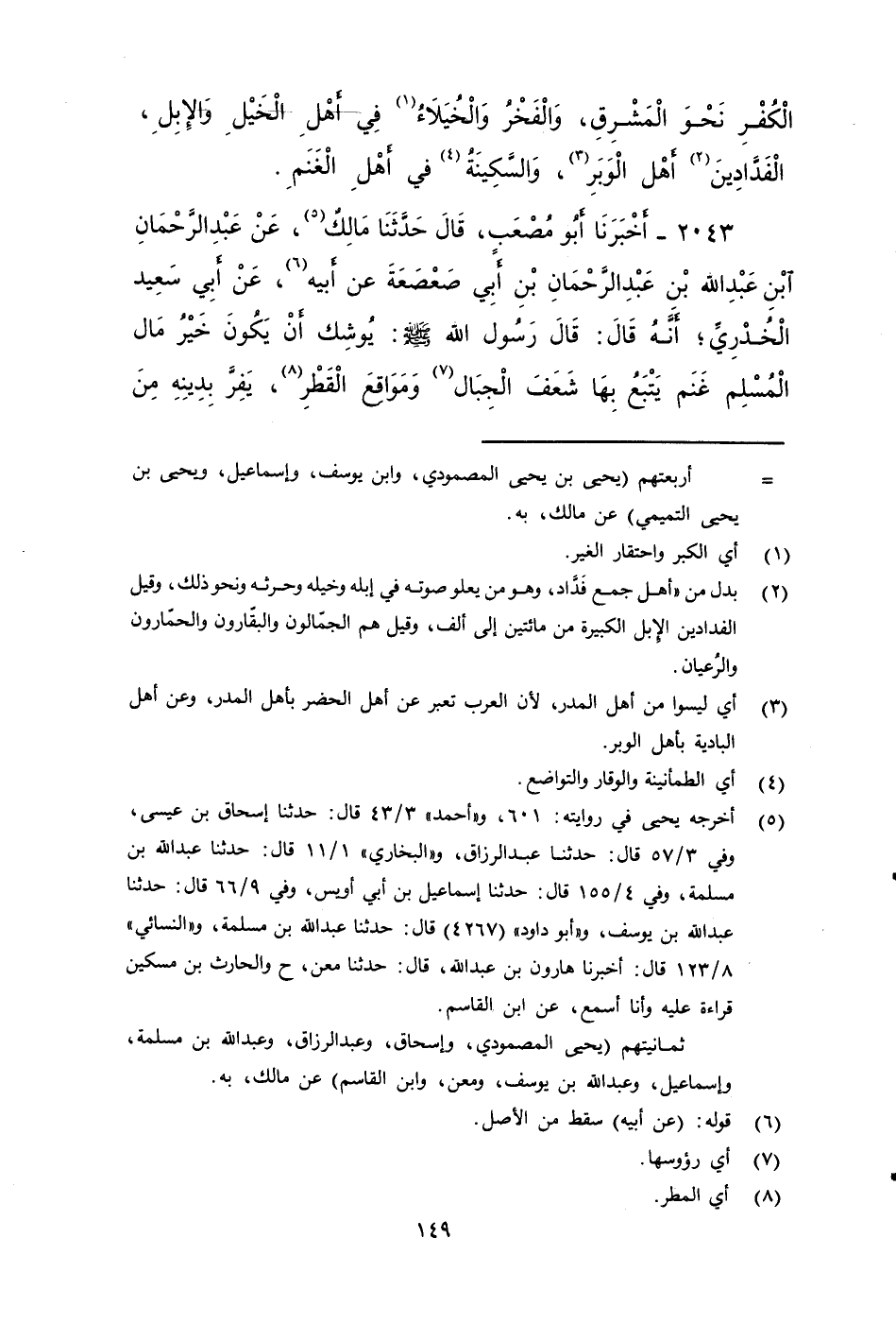 ٢٠٤٣ - أَخْبَرَنَا أَبُو مُصْعَبٍ، قَالَ: حَدَّثَنَا مَالِكٌ، عَنْ عَبْدِ الرَّحْمَنِ بْنِ عَبْدِ اللَّهِ بْنِ عَبْدِ الرَّحْمَنِ بْنِ أَبِي صَعْصَعَةَ، عَنْ أَبِيهِ، عَنْ أَبِي سَعِيدٍ الْخُدْرِيِّ، أَنَّهُ قَالَ: قَالَ رَسُولُ اللَّهِ صَلى الله عَلَيه وَسَلم: يُوشِكُ أَنْ يَكُونَ خَيْرَ مَالِ الْمُسْلِمِ غَنَمٌ يَتْبَعُ بِهَا شَعَفَ الْجِبَالِ، وَمَوَاقِعَ الْقَطْرِ يَفِرُّ بِدِينِهِ مِنَ الْفِتَنِ.