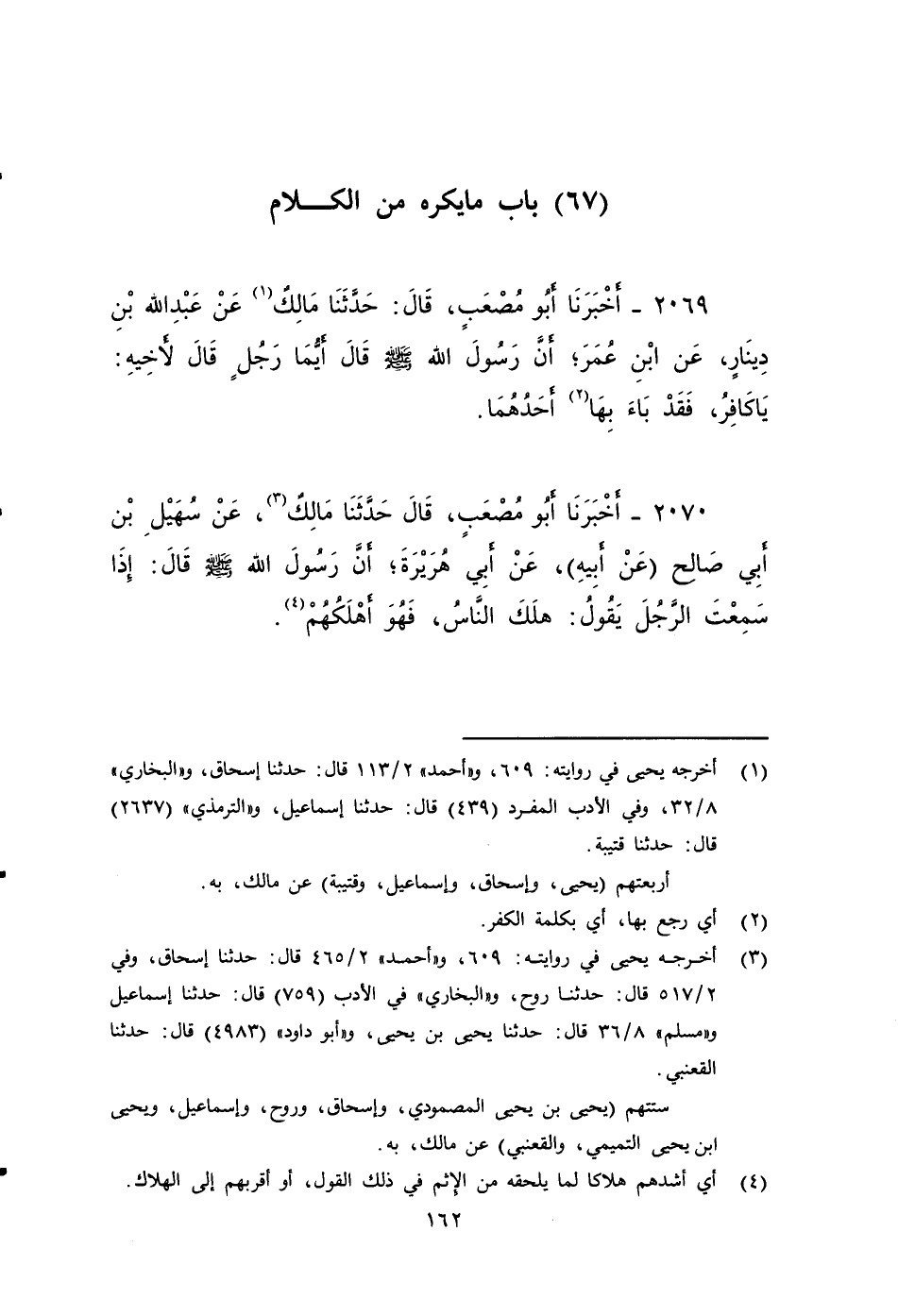 ٢٠٦٩ - أَخْبَرَنَا أَبُو مُصْعَبٍ، قَالَ: حَدَّثَنَا مَالِكٌ، عَنْ عَبْدِ اللَّهِ بْنِ دِينَارٍ، عَنِ ابْنِ عُمَرَ، أَنَّ رَسُولَ اللَّهِ صَلى الله عَلَيه وَسَلم قَالَ: أيما رجل: قَالَ لِأَخِيهِ: كَافِرٌ، فَقَدْ بَاءَ بِهَا أَحَدُهُمَا.