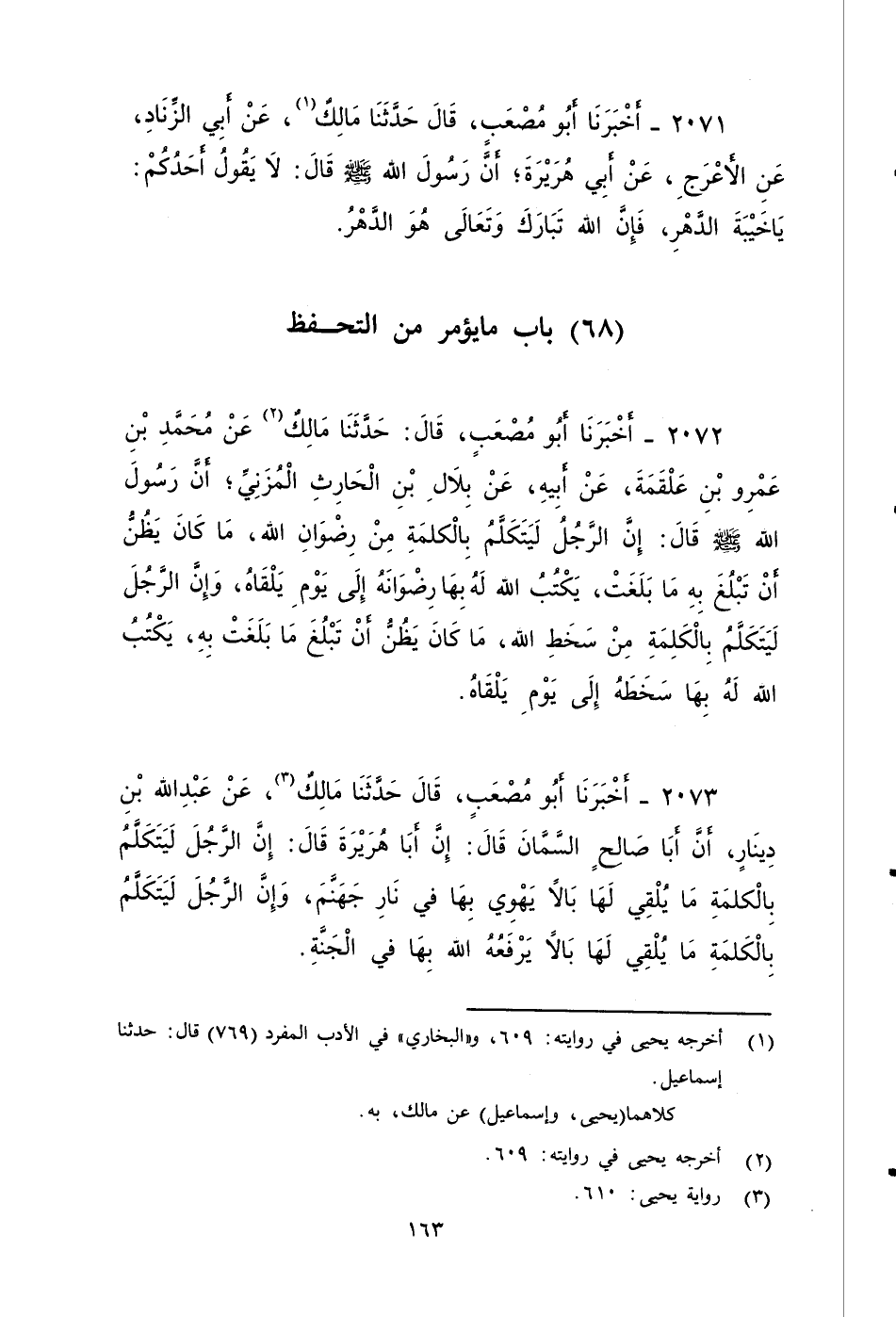 ٢٠٧٣ - أَخْبَرَنَا أَبُو مُصْعَبٍ، قَالَ: حَدَّثَنَا مَالِكٌ، عَنْ عَبْدِ اللَّهِ بْنِ دِينَارٍ، أَنَّ أَبِا صَالِحٍ السَّمَّانِ، قال: إن أَبَا هُرَيْرَةَ، قَالَ: إِنَّ الرَّجُلَ لَيَتَكَلَّمُ بِالْكَلِمَةِ مَا يُلْقِي لَهَا بَالًا، يَهْوِي بِهَا فِي نَارِ جَهَنَّمَ، وَإِنَّ الرَّجُلَ لَيَتَكَلَّمُ بِالْكَلِمَةِ مَا يُلْقِي لَهَا بَالًا، يَرْفَعُهُ اللَّهُ بِهَا فِي الْجَنَّةِ.