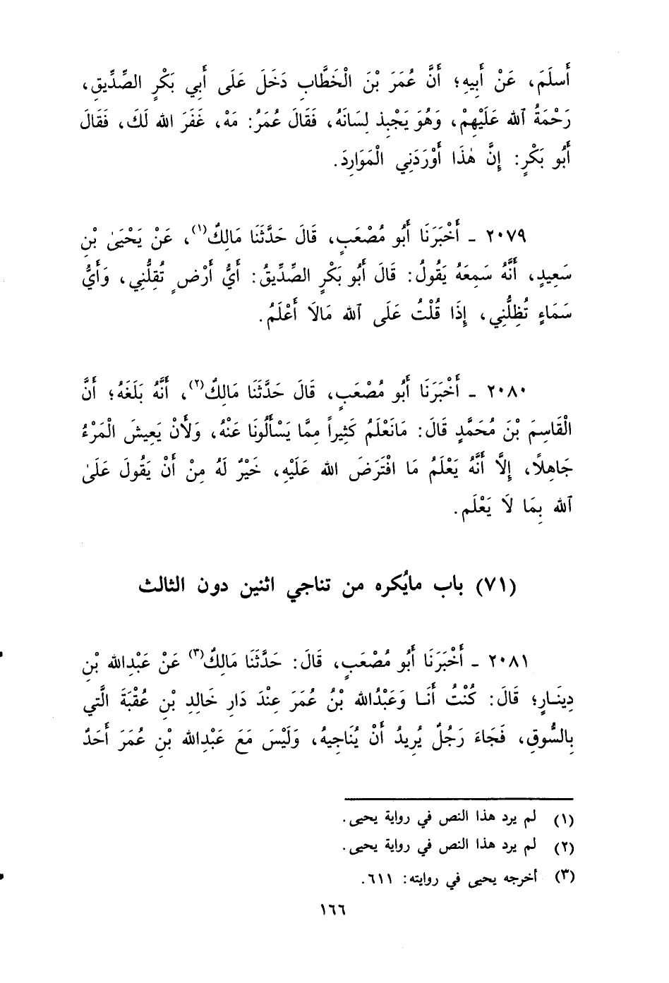 ٢٠٨٠ - أَخْبَرَنَا أَبُو مُصْعَبٍ، قَالَ: حَدَّثَنَا مَالِكٌ، أَنَّهُ بَلَغَهُ , أَنَّ الْقَاسِمَ بْنَ مُحَمَّدٍ قَالَ: مَا نَعْلَمُ كَثِيرًا مِمِّا يَسْأَلُونَا عَنْهُ، وَلأَنْ يَعِيشَ الْمَرْءُ جَاهِلاً، إِلَاّ أَنَّهُ يَعْلَمُ مَا افْتَرَضَ اللهُ عَلَيْهِ، خَيْرٌ لَهُ مِنْ أَنْ يَقُولَ عَلَى اللهِ بِمَا لَا يَعْلَم.