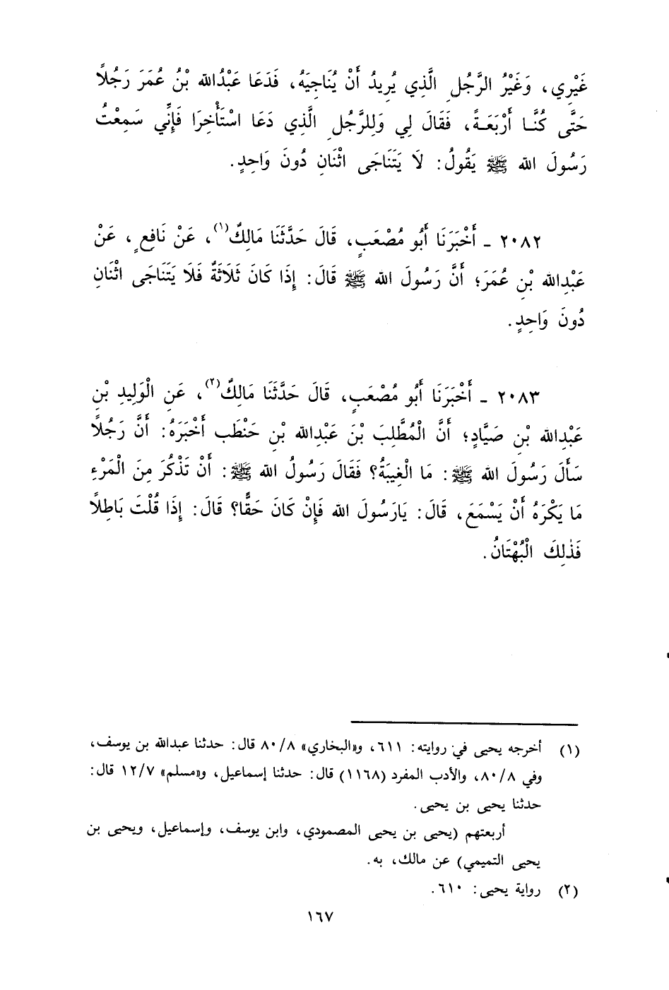 ٢٠٨٢ - أَخْبَرَنَا أَبُو مُصْعَبٍ، قَالَ: حَدَّثَنَا مَالِكٌ، عَنْ نَافِعٍ، عَنِ ابْنِ عُمَرَ، أَنَّ رَسُولَ اللَّهِ صَلى الله عَلَيه وَسَلم قَالَ: إِذَا كَانَ ثَلَاثَةٌ فَلَا يَتَنَاجَى اثْنَانِ دُونَ وَاحِدٍ.