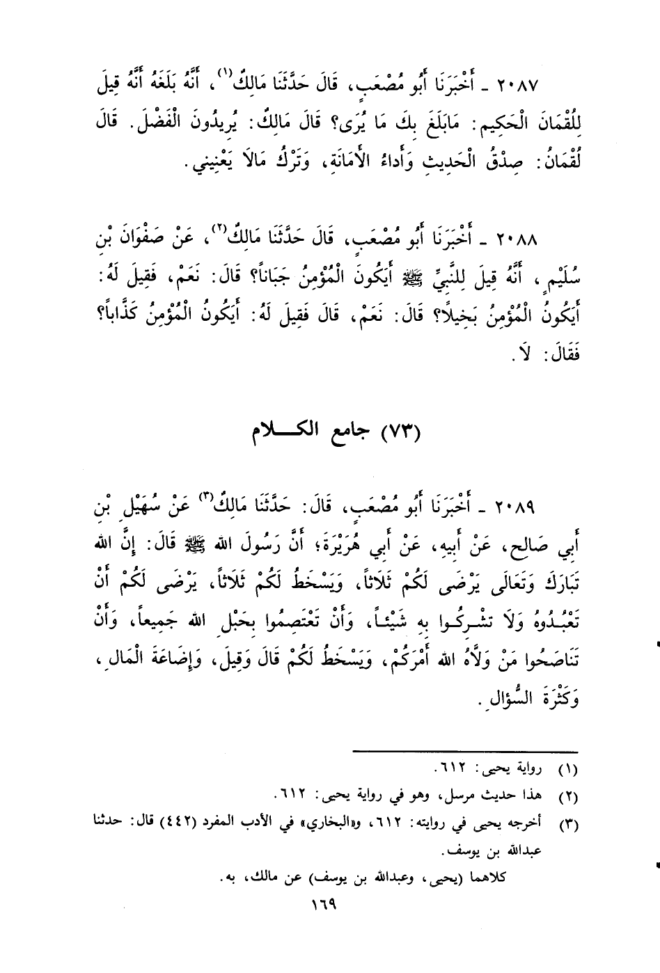 ٢٠٨٨ - أَخْبَرَنَا أَبُو مُصْعَبٍ، قَالَ: حَدَّثَنَا مَالِكٌ، عَنْ صَفْوَانَ بْنِ سُلَيْمٍ، أَنَّهُ قِيلَ للنبي صَلى الله عَلَيه وَسَلم: أَيَكُونُ الْمُؤْمِنُ جَبَانًا؟ قَالَ: نَعَمْ، فَقِيلَ لَهُ: أَيَكُونُ الْمُؤْمِنُ بَخِيلًا؟ قَالَ: نَعَمْ، قال: فَقِيلَ لَهُ: أَيَكُونُ الْمُؤْمِنُ كَذَّابًا؟ فَقَالَ: لا.