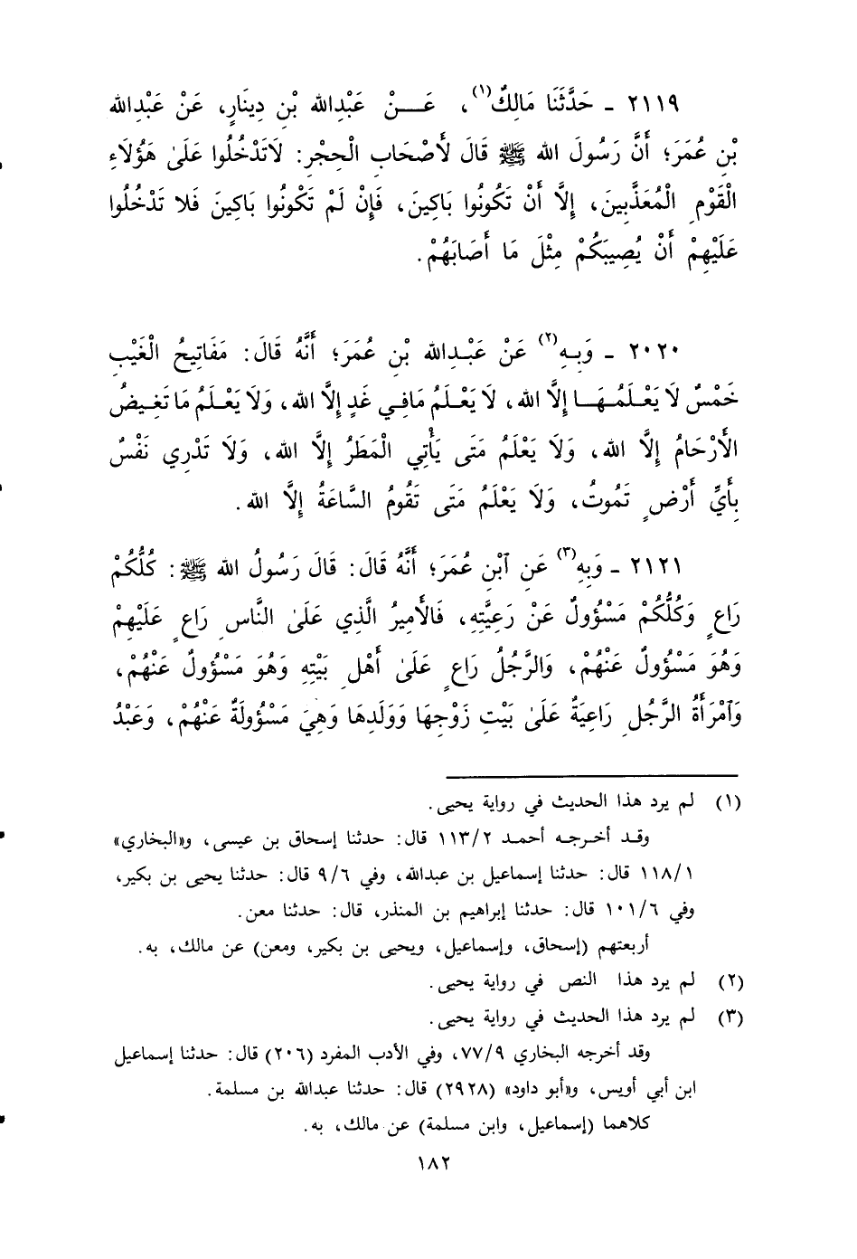 ٢١٢١ - وبه عَنْ ابن عُمَر، أَنَّهُ قَالَ: قَالَ رَسُول الله صَلى الله عَلَيه وَسَلم: كلكم راعٍ وكلكم مسئول عَنْ رعيته، فالأمير الّذي عَلَى الناس راعٍ عليهم وهو مسئول عنهم، والرجل راعٍ عَلَى أهل بيته وهو مسئول عنهم وامرأة الرجل راعية عَلَى بيت زوجها وولدها وهي مسئولة عنهم، وعبد الرجل راعٍ عَلَى مال سيده وهو مسئول عَنْ رعيته.
