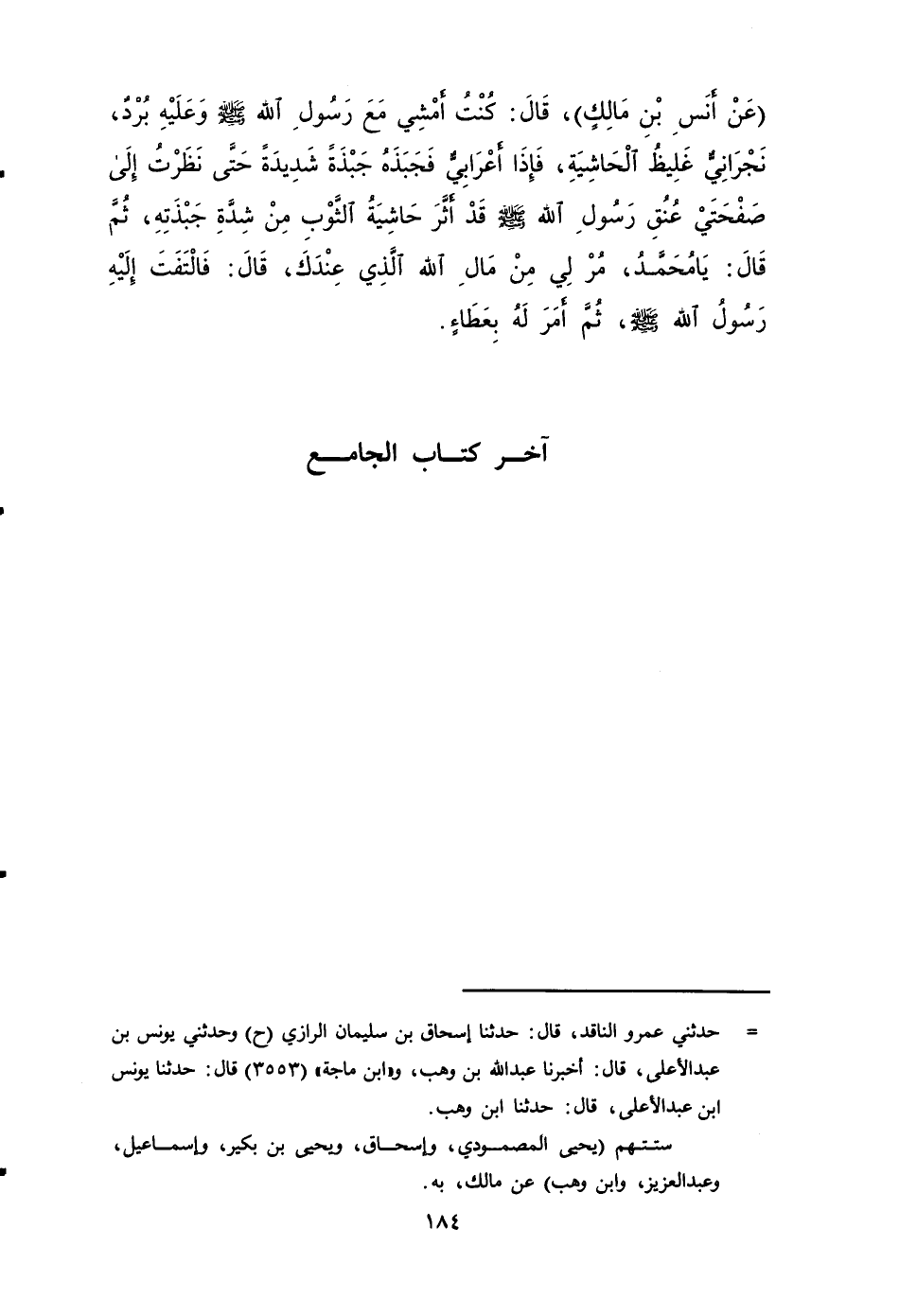 ٢١٢٤ - حَدَّثَنَا مَالِكٌ، عَنْ إِسْحَاق بْن عَبْد الله بْن أَبِي طلحة، عَنْ أنس بْن مالكٍ، قَالَ: كنت أمشي مَعَ رَسُول الله صَلى الله عَلَيه وَسَلم وعليه برد نجراني غليظ الحاشية، فإذا أعرابي فجبذه جبذة شديدة حتى نظرت إِلى صفحتي عنق رَسُول الله صَلى الله عَلَيه وَسَلم قد أثر حاشية الثوب من شدة جبذته، ثُمَّ قَالَ: يا مُحَمَّد مر لي من مال الله الّذي عندك، قَالَ: فالتفت إِلَيْهِ رَسُول الله صَلى الله عَلَيه وَسَلم، ثُمَّ أمر لَهُ بعطاءٍ.