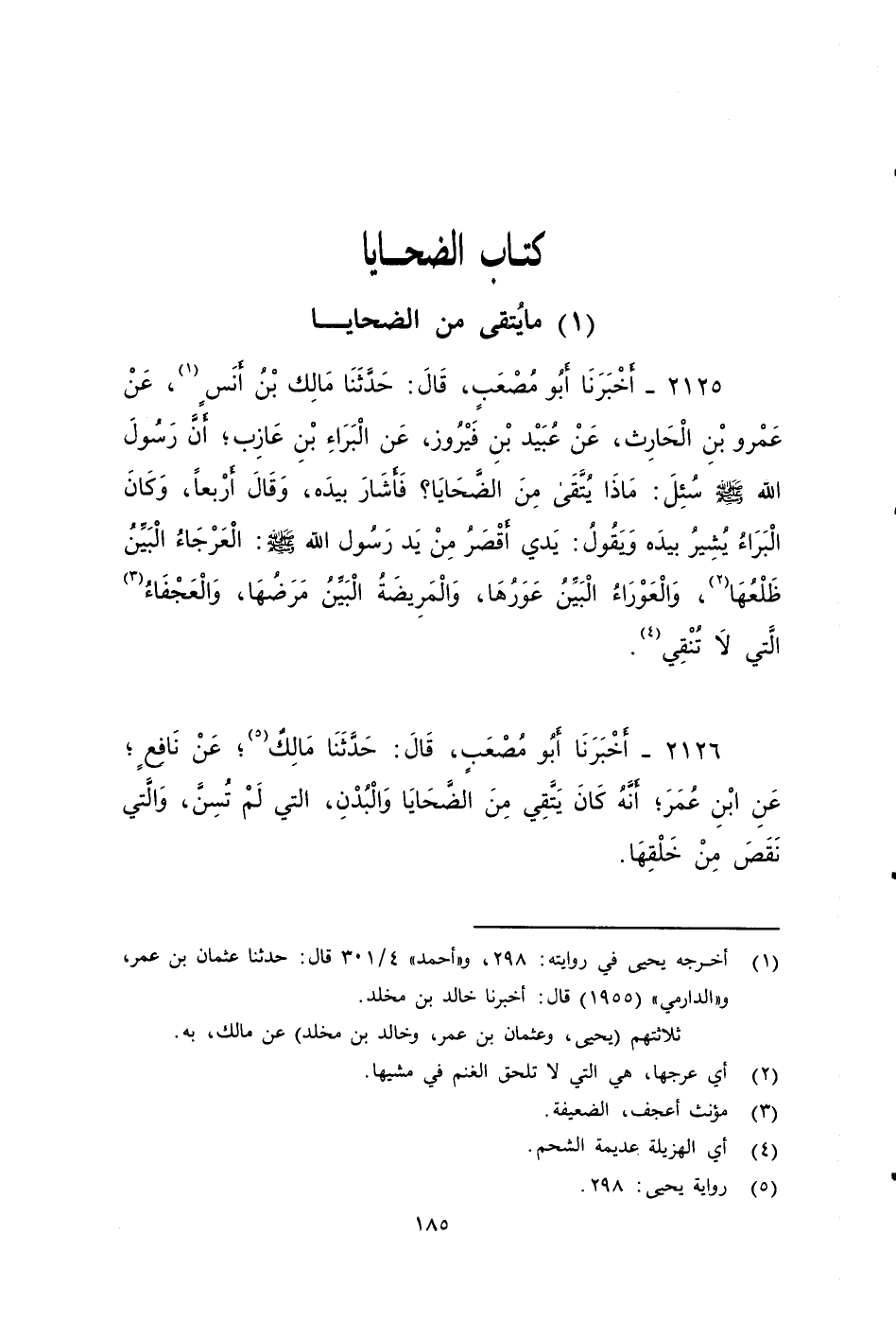 ٢١٢٥ - أَخْبَرَنَا أَبُو مُصْعَبٍ، قَالَ: حَدَّثَنَا مَالِكٌ بن أنس، عَنْ عَمْرِو بْنِ الْحَارِثِ، عَنْ عُبَيْدِ بْنِ فَيْرُوزٍ، عَنْ الْبَرَاءِ بْنِ عَازِبٍ، أَنَّ رَسُولَ اللَّهِ صَلى الله عَلَيه وَسَلم سُئِلَ: مَاذَا يُتَّقَى مِنَ الضَّحَايَا؟ فَأَشَارَ بِيَدِهِ، وَقَالَ: أَرْبَعًا وَكَانَ الْبَرَاءُ يُشِيرُ بِيَدِهِ، وَيَقُولُ: يَدِي أَقْصَرُ مِنْ يَدِ رَسُولِ اللَّهِ صَلى الله عَلَيه وَسَلم الْعَرْجَاءُ الْبَيِّنُ ظَلْعُهَا، وَالْعَوْرَاءُ الْبَيِّنُ عَوَرُهَا، وَالْمَرِيضَةُ الْبَيِّنُ مَرَضُهَا، وَالْعَجْفَاءُ الَّتِي لا تُنْقِي.