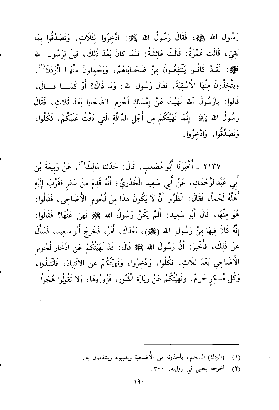 ٢١٣٧ - أَخْبَرَنَا أَبُو مُصْعَبٍ، قَالَ: حَدَّثَنَا مَالِكٌ، عَنْ رَبِيعَةَ بْنِ أَبِي عَبْدِ الرَّحْمَنِ، عَنْ أَبِي سَعِيدٍ الْخُدْرِيِّ، أَنَّهُ قَدِمَ مِنْ سَفَرٍ فقرب إِلَيْهِ أَهْلُهُ لَحْمًا، فَقَالَ: انْظُرُوا أَنْ لا يَكُونَ هَذَا مِنْ لُحُومِ الأَضْحَى، فَقَالُوا: هُوَ مِنْهَا، قَالَ أَبُو سَعِيدٍ: أَلَمْ يَكُنْ رَسُولُ اللَّهِ صَلى الله عَلَيه وَسَلم نَهَى عَنْهَا؟ ، فَقَالُوا: إِنَّهُ كَانَ فيها مِنْ رَسُولِ اللَّهِ صَلى الله عَلَيه وَسَلم بَعْدَكَ أَمْرٌ فَخَرَجَ أَبُو سَعِيدٍ، فَسَأَلَ عَنْ ذَلِكَ فَأُخْبِرَ أَنَّ رَسُولَ اللَّهِ صَلى الله عَلَيه وَسَلم قَالَ: قد نَهَيْتُكُمْ عَنْ إدخار لُحُومِ الأَضْاحَى بَعْدَ ثَلَاثٍ فَكُلُوا، وَادَّخِرُوا، وَنَهَيْتُكُمْ عَنِ الانْتِبَاذِ، فَانْتَبِذُوا، وَكُلُّ مُسْكِرٍ حَرَامٌ، وَنَهَيْتُكُمْ عَنْ زِيَارَةِ الْقُبُورِ، فَزُورُوهَا وَلَا تَقُولُوا هُجْرًا.