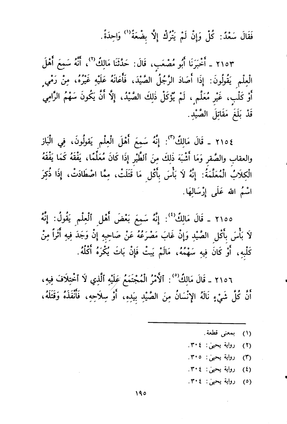 ٢١٥٦ - قَالَ مَالِكٌ: الأََمْرُ الْمُجْتَمَعُ عَلَيْهِ , الَّذِي لَا اخْتِلَافَ فِيهِ , أن كُلُّ شَيْءٍ نَالُهُ الإِنْسَانُ من الصيد بِيَدِهِ أَوْ سِلَاحِهِ , فَأَنْفَذَهُ وَقَتلَه، فإنه لابأس بأكله يقَولَ اللَّهُ تَبَارَكَ وَتَعَالَى: {لَيَبْلُوَنَّكُمُ اللَّهُ بِشَيْءٍ مِنَ الصَّيْدِ تَنَالُهُ أَيْدِيكُمْ وَرِمَاحُكُمْ} قَالَ: فَكُلُّ شَيْءٍ نَالُهُ الرجل بِيَدِهِ أَوْ بِسِلَاحِهِ , فَأَنْفَذَهُ حتى يبَلَغَ مَقَاتِلَهُ ,فلابأس بأكله.