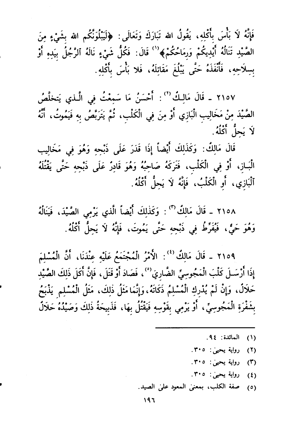 ٢١٥٩ - قَالَ مَالِكٌ: الأََمْرُ الْمُجْتَمَعُ عَلَيْهِ عِنْدَنَا: أَنَّ الْمُسْلِمَ إِذَا أَرْسَلَ كَلْبَ الْمَجُوسِيِّ الضَّارِيَ , فَصَادَ أَوْ قَتَلَ , فإِنَّ أَكْلُ ذَلِكَ الصَّيْدِ حَلَالٌ، وَإِنْ لَمْ يُدرك الْمُسْلِمُ ذَكِّاتهِ، وَإِنَّمَا مَثَلُ ذَلِكَ مَثَلُ الْمُسْلِمِ يَذْبَحُ بِشَفْرَةِ الْمَجُوسِيِّ، أَوْ يَرْمِي بِقَوْسِهِ , فَيَقْتُلُ بِهَا , فذَبِيحَتُهُ ذَلِكَ وصَيْدُهُ حَلَالٌ أَكْلِهِ , قَالَ مَالِكٌ: وَإِن أَرْسَلَ الْمَجُوسِيُّ كَلْبَ الْمُسْلِمِ الضَّارِيَ عَلَى صَيْدٍ , فَأَخَذَهُ، فَإِنَّهُ لَا يُؤْكَلُ ذَلِكَ الصَّيْدُ إِلَاّ أَنْ يُذَكَّيه المسلم، وَإِنَّمَا مَثَلُ ذَلِكَ مَثَلُ قَوْسِ الْمُسْلِمِ، وَنَبْلِهِ , يَأْخُذُهَا الْمَجُوسِيُّ فَيَرْمِي بِهَا الصَّيْدَ فَيَقْتُلُهُ، فَلَا يَحِلُّ أَكْلُ شَيْءٍ مِنْ ذَلِكَ.